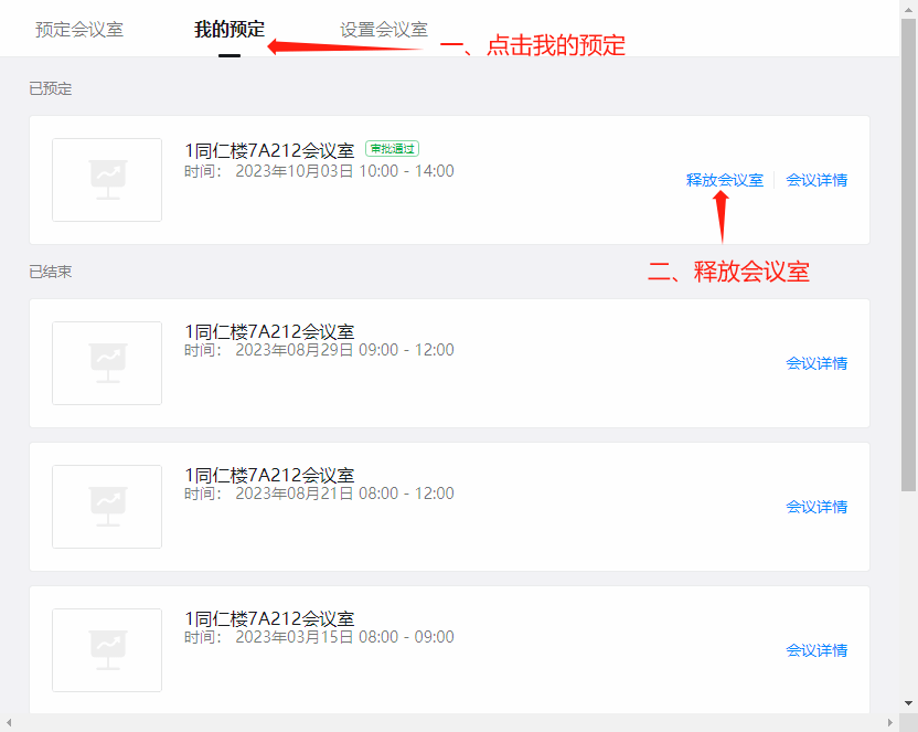 因故取消会议时,应及时在钉钉电脑端“我的预定”中释放会议室,以便其他部门预定和使用会议室。