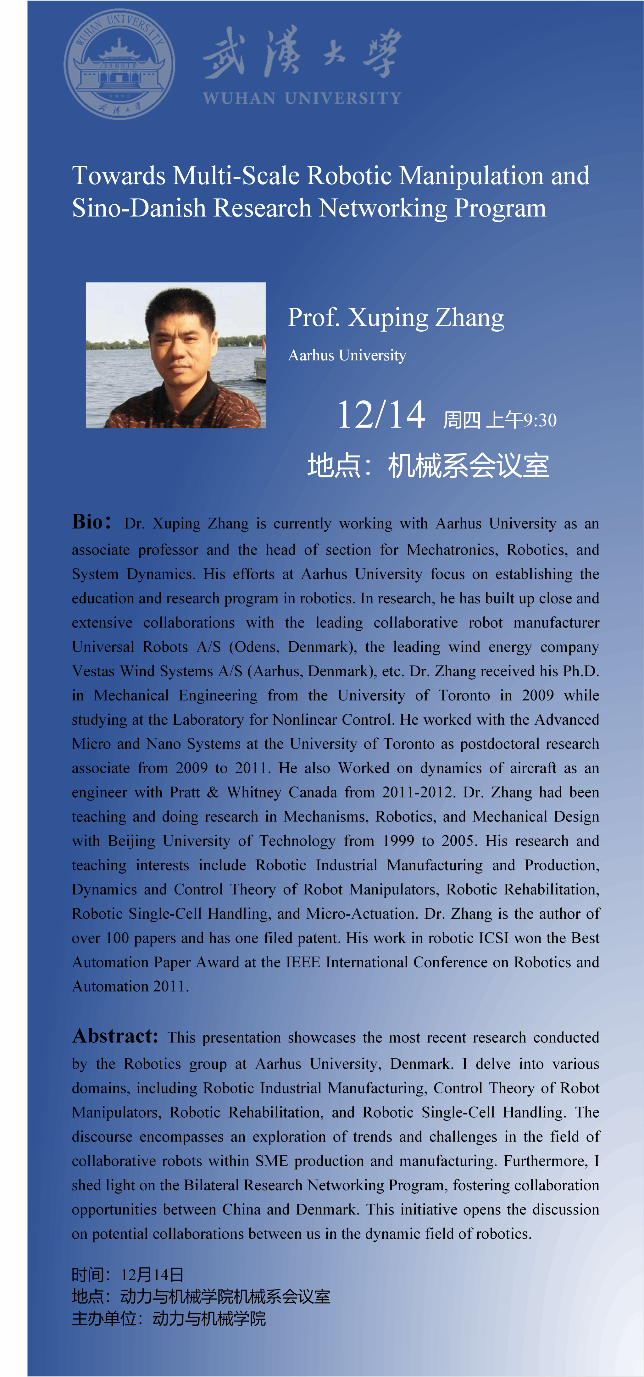12月14日上午,丹麦奥胡斯大学(Aarhus University)Xuping Zhang教授受杏吧 孙韵韵副研究员邀请进行学术报告。刘胜院长、巫世晶老师、王晓笋老师、马彦昭老师、郭朝老师、李登老师以及学院相关领域研究生参加讨论。Xuping Zhang教授目前是丹麦奥胡斯大学机械工程系机械一体化及动力学学科主任,承担丹麦创新基金和欧洲地平线2020等项目,主要从事机器人设计和控制研究,特别关注机器人应用在制造和生物工程等方面的挑战及解决方案。