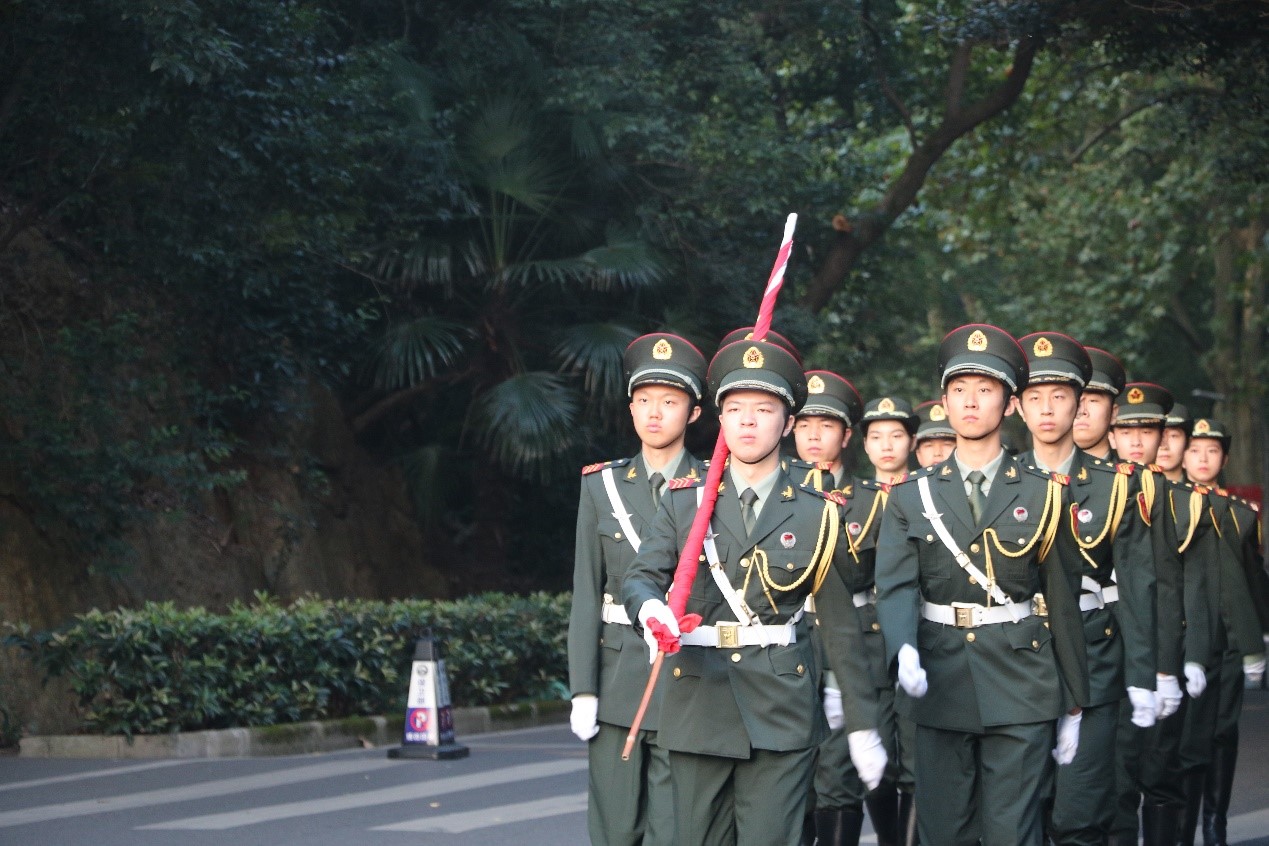 国庆仪仗队在晨光中迈着有力的步伐,整齐走进场地,列队国旗两旁。他们刚毅的眼神彰显着中国人的自信,他们坚定的站姿饱含着中国人的骄傲,他们笔直的队列踏出了中国人不断向前的道路。国旗交接毕,随着《义勇军进行曲》的奏起,伴着朝阳的升起,五星红旗缓慢而又坚定地向上升,势如破竹、势不可挡。