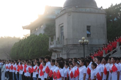 而后,同学们齐唱《歌唱祖国》。满载着爱国热情的歌声向四方扩散,向古今飞扬。也许那些为国捐躯的烈士们能够看见这盛世,能够听见这歌声。这是新生代的嗓音,这是珞珈人向世界发出的热血誓言。