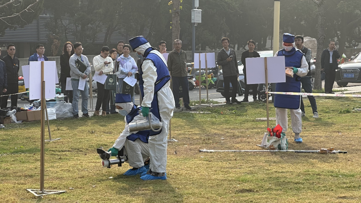 在工学部一教学楼前的草坪上,培训团队还开展了一场生动的辐射应急监测演练。穿好防护服、调查现场环境、多台仪器配合、布置警戒区、找到危险源、消除危险......学员们兴致高涨地参加了实操演练,在教学团队的指导下认真体验应急监测的全过程。学员们纷纷表示,现场教学不仅让他们对学到的知识有了更深刻的理解,也收获了宝贵的实操经验,是对自己能力的一次重要提升。