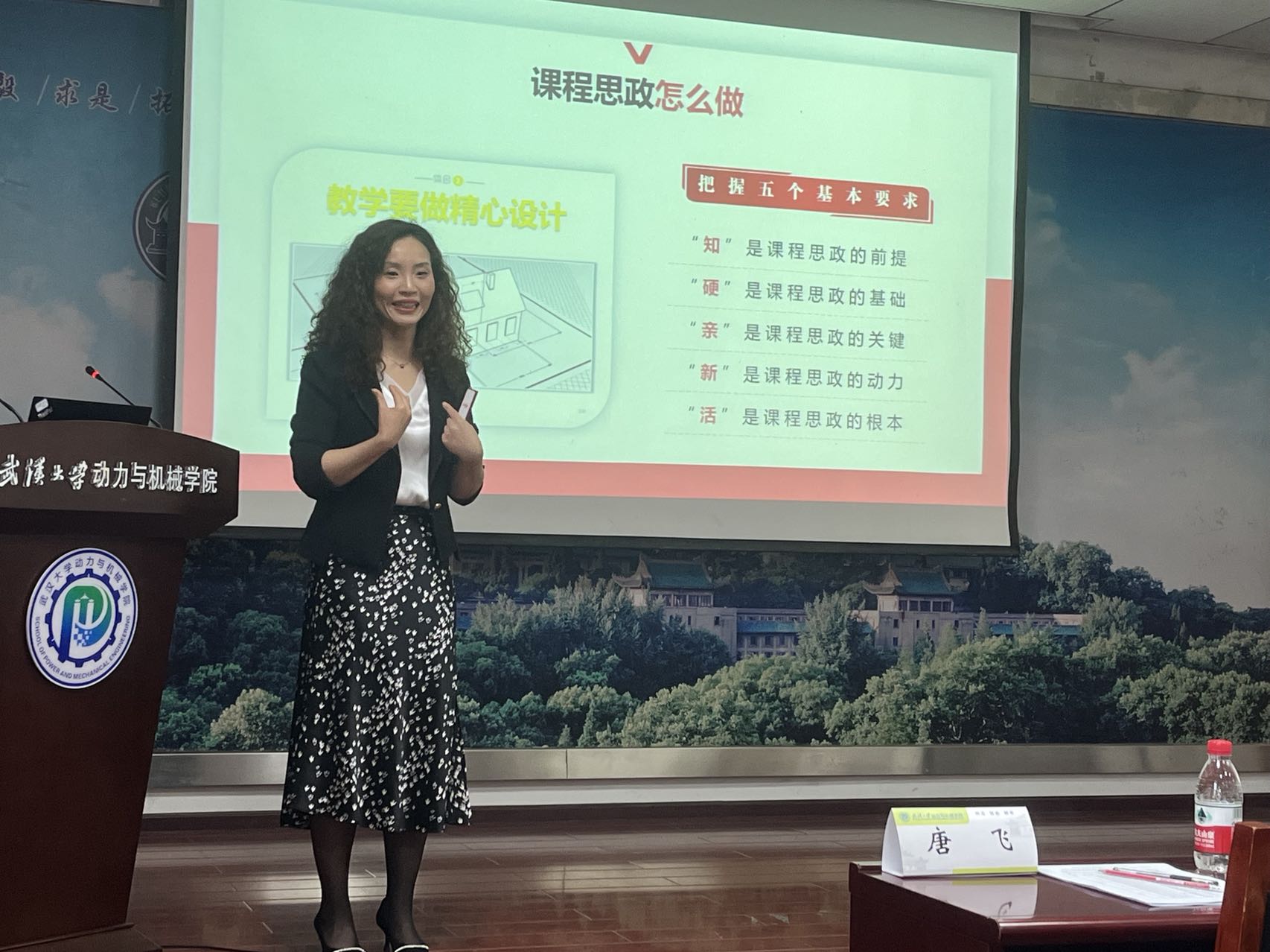 杜莉以《课程思政的道与术》为题,对课程思政进行了深入浅出的剖析,她特别强调青年教师结合专业分类推进课程思政建设,重视身为人师的言传身教,并以十九届五中全会为例,示范了如何在课堂上引导学生共同探讨课程思政的方式方法。黄海兰从课程思政的地位、内涵和实现简要阐述了如何将思政元素与课堂有机结合起来,她结合测绘专业大类平台课程《数字地形测量学》,以“思政筑基、测天绘地”为题,从课程概况与课程思政、教学内容与思政元素、教学方法与思政目标、教学过程与思政故事、教学评价与思政效果等五个方面着手,全面分析了课程思政实现的路径、方法与效果评价。尹颢以《理论力学》中《物体的重心》这一章节为例,以跳高运动为切入点讲解了“重心”这一概念,为大家示范了如何结合生活实际开展课堂教学。三位嘉宾的讲课,让青年教师深受启发,给竞赛增添了精彩。