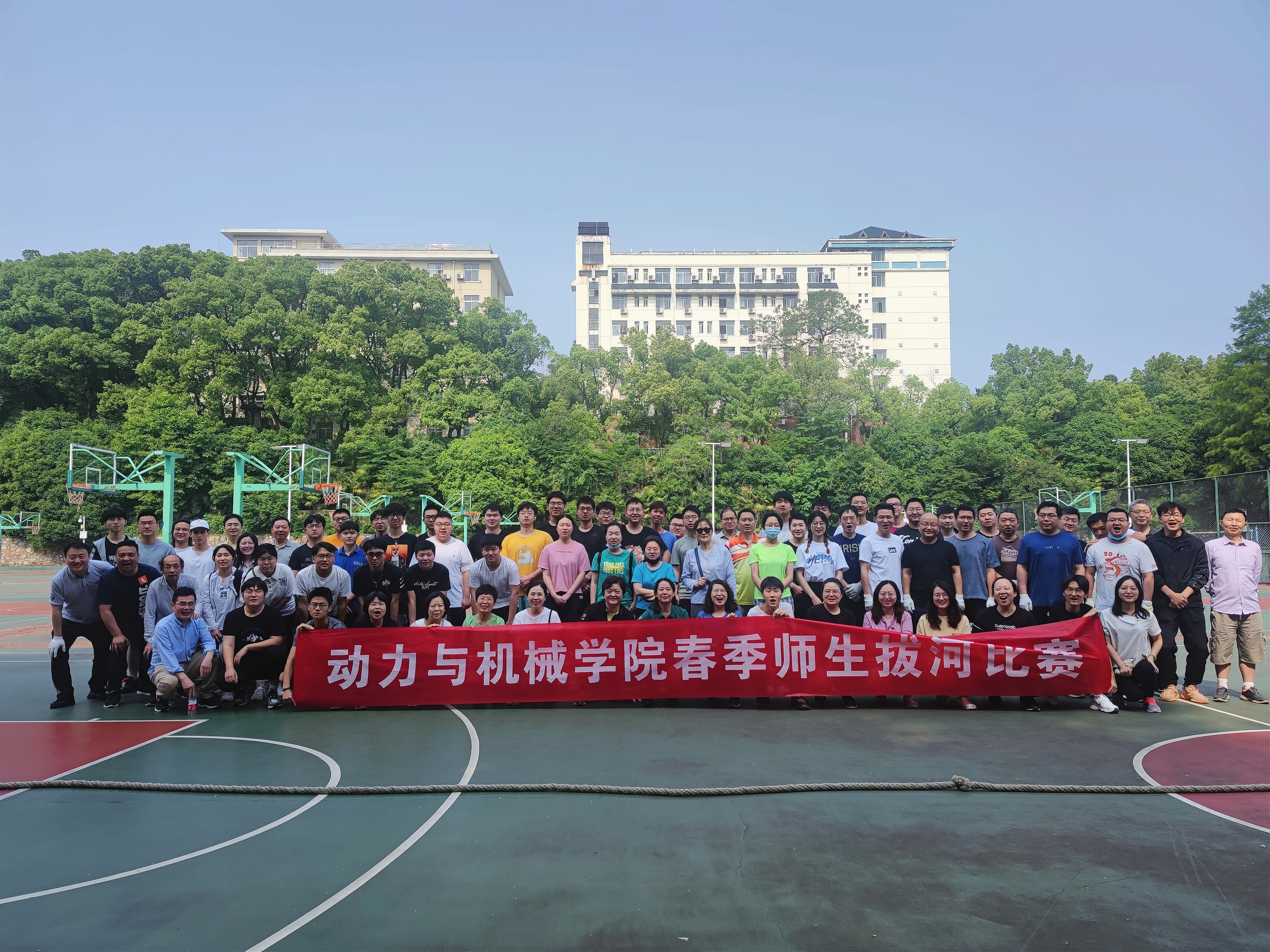 (通讯员:院会体育部 摄影:黄呈棋 审核:匡松)2022年5月8日上午,杏吧 百余名师生(本科生)在工学部篮球场举行了拔河比赛。本次比赛由院工会和院学生会联合举办,以加强师生纽带、促进师生交流为宗旨,丰富师生们的校园生活为目的,发扬团队精神,增强凝聚力。学院广大教师同学们以极大的热情参与到此次活动中。学院党委书记孙萍,副书记匡松、李坡,副院长邓勇等五十余名教职工参与本次活动。