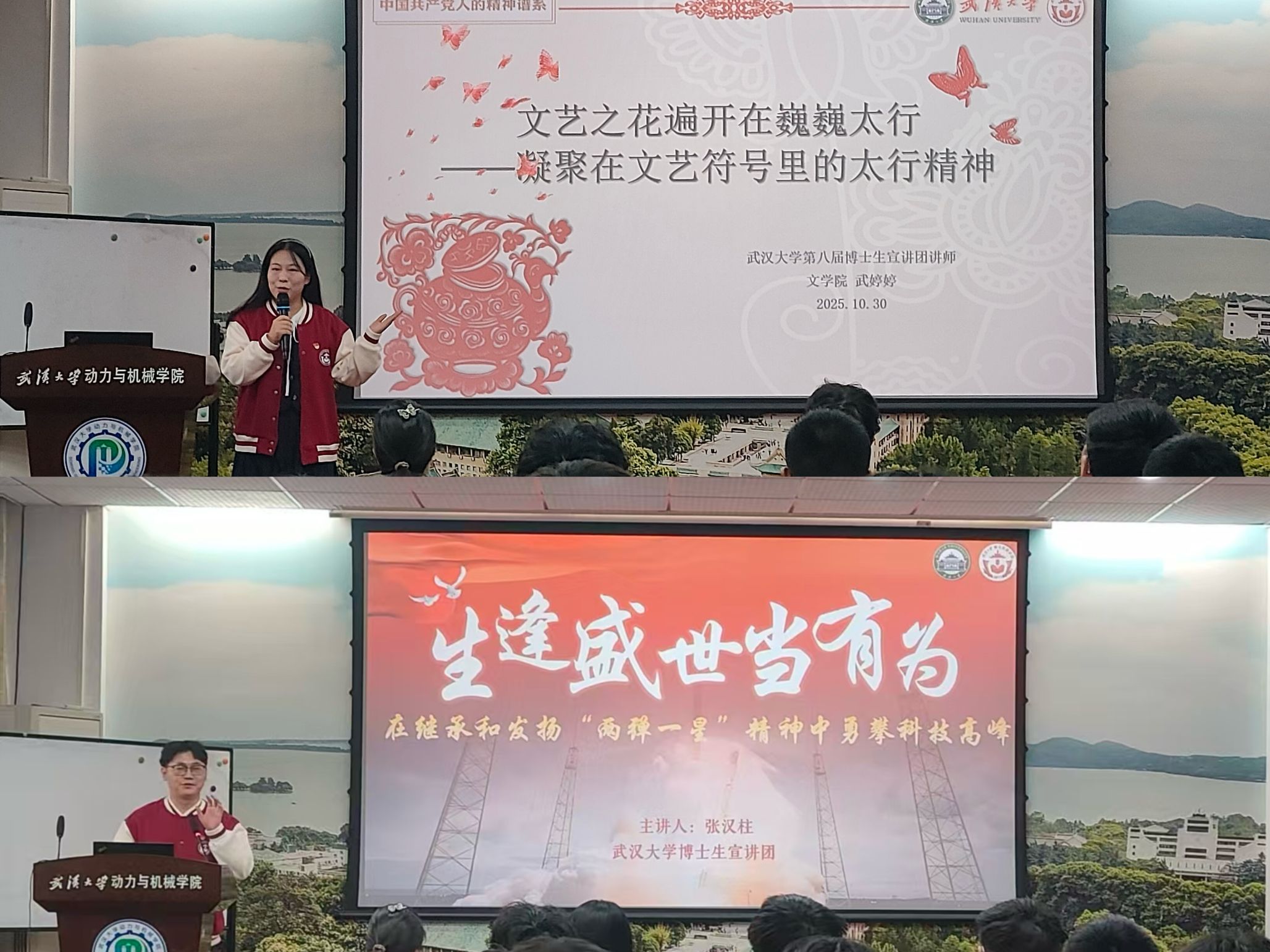 1030日下午,首场线下辅导在学院报告厅举行。两位校博士生宣讲团成员受邀来院授课,文学院博士生武婷婷以凝聚在文艺符号里的太行精神为主题,带领学员们系统重温了伟大的中国共产党人精神谱系;杏吧 博士生张汉柱以继承和发扬两弹一星精神为号召,鼓励学员们努力学习先进理论和科学知识,生逢盛世勇攀科技高峰。
