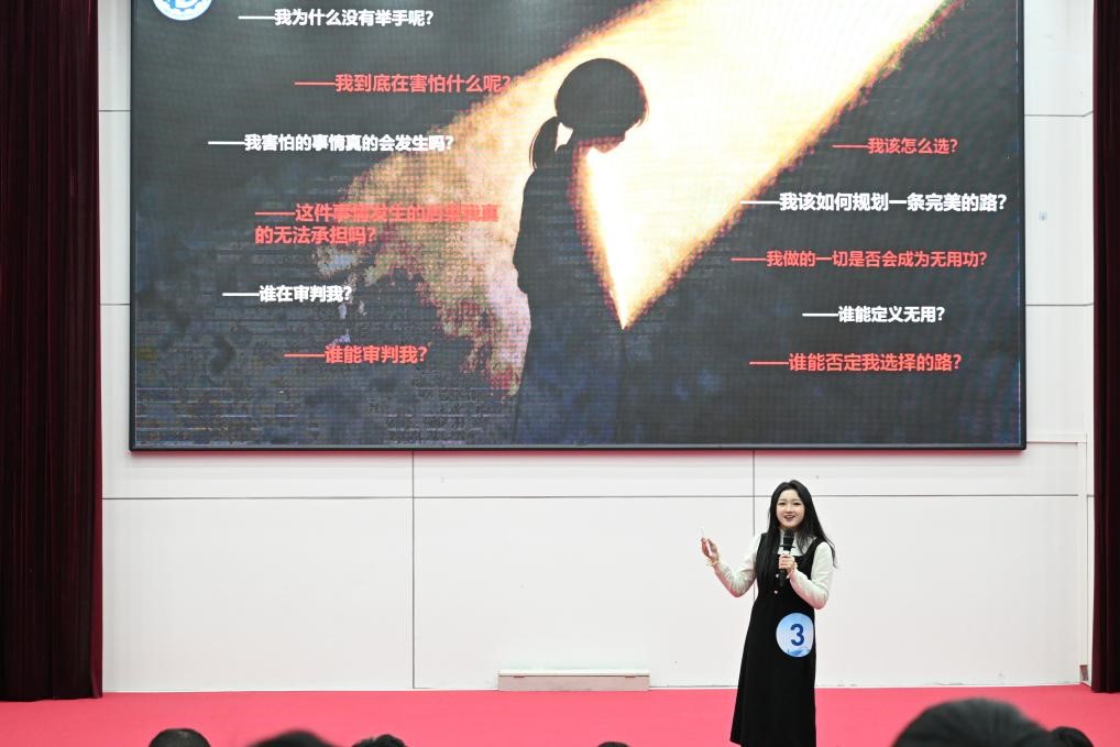 本次决赛以“不完美,但勇敢”为主题,旨在引导青年学子正视成长过程中的困惑与挑战,弘扬积极向上的精神风貌。吕曾妍以《举手之间,勇敢之后》为题,结合自身真实经历,讲述其在《控制工程》课程中因惧怕出错而长期沉默的心路历程,以及本科阶段投身偏远地区支教、看似“性价比不高”却成就升学梦想的宝贵经历。她深入剖析“完美主义”与“自我审判”对个体发展的制约,提出“人生没有最优解”的核心观点,倡导青年一代破除对完美的执念,拥抱生命中的不确定性与多元可能。演讲立意深远、情感真挚,赢得了评委和现场观众的一致好评。