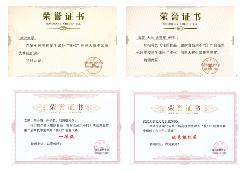 2022521日,由湖北省核学会主办、三峡大学机械与动力学院承办的湖北省第二届高校学生课外+X创意大赛中,该作品获得省一等奖,由湖北省+X创意大赛组委会推荐参加第七届全国高校学生课外+X创意大赛。