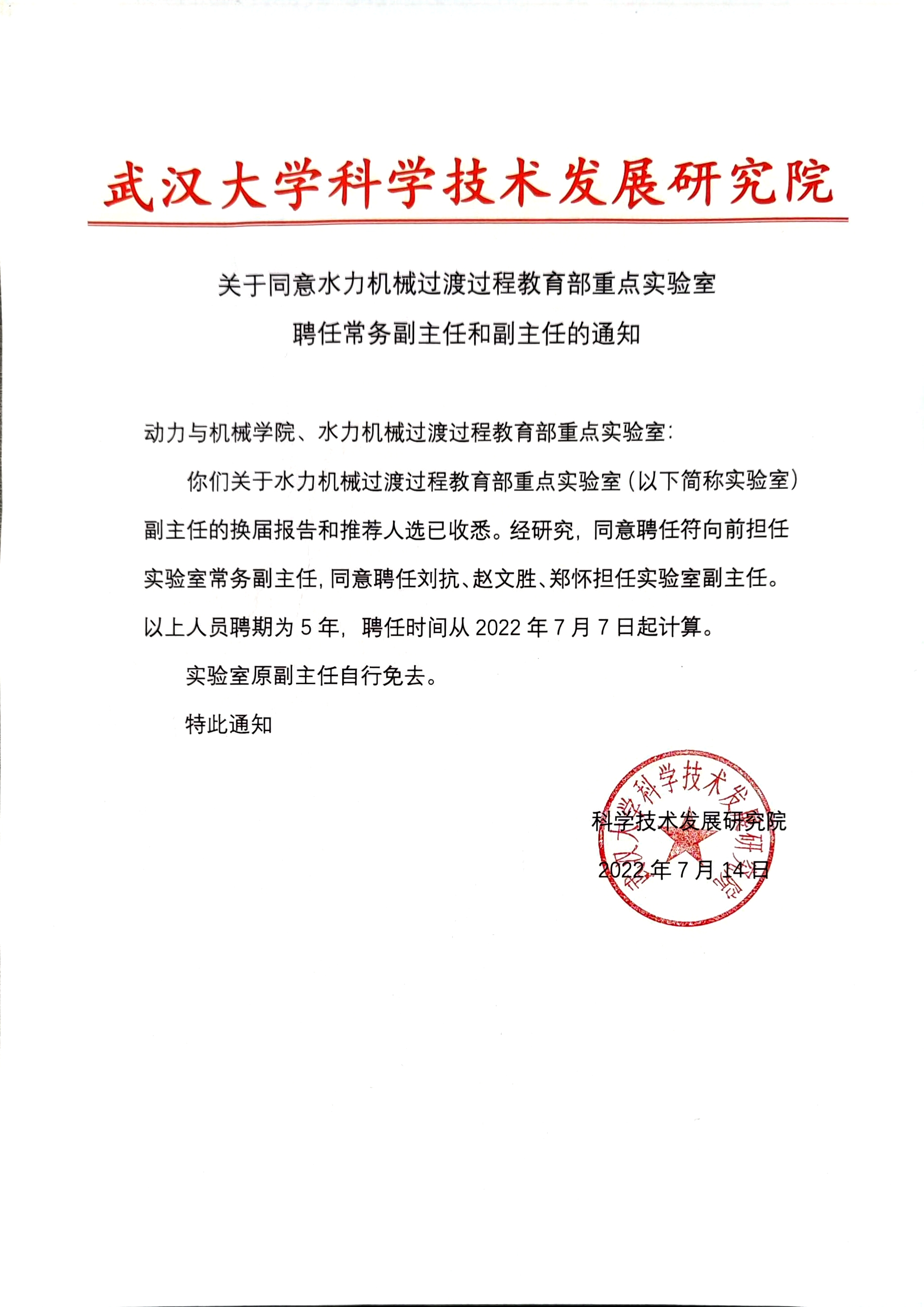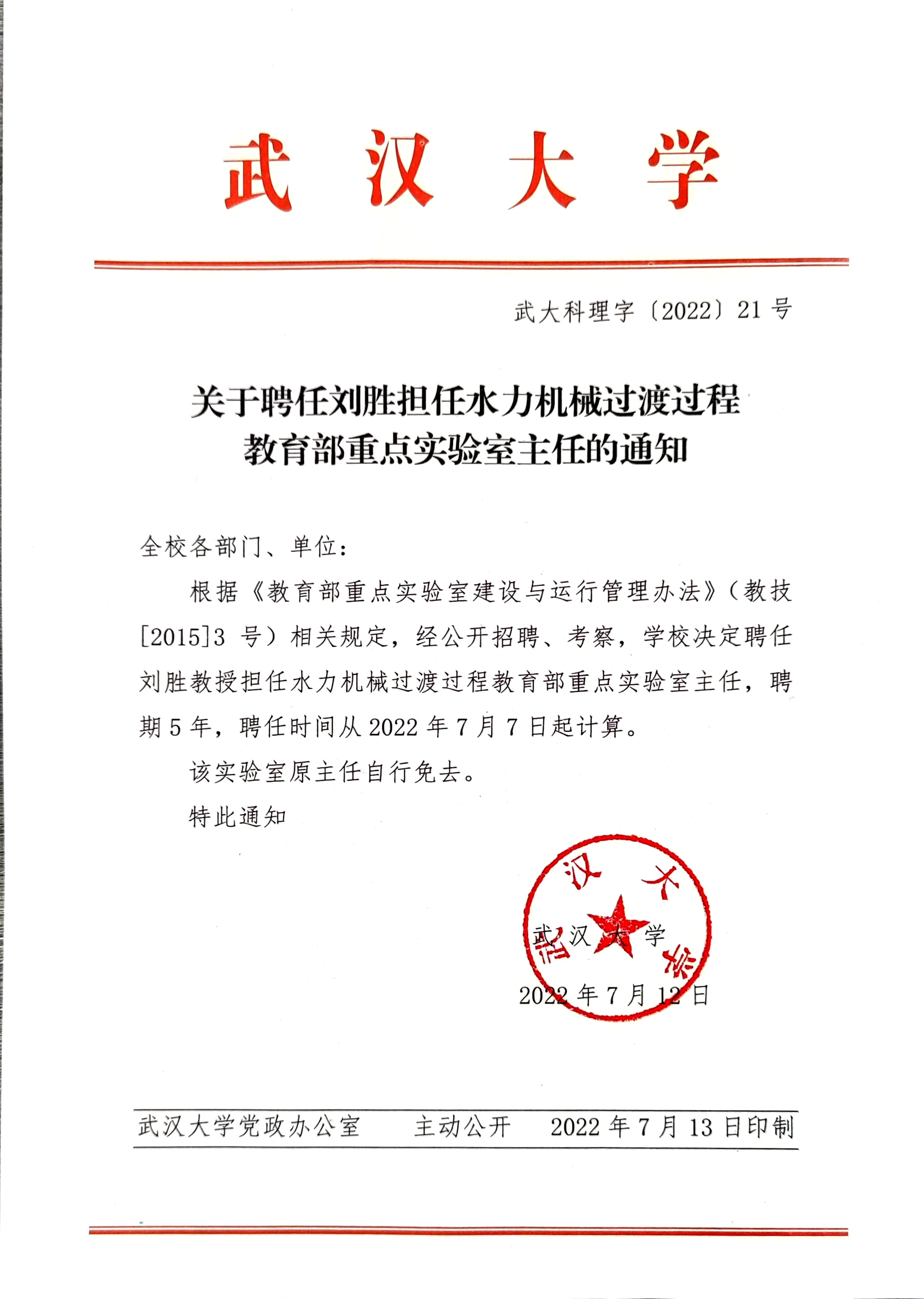 【杏吧 】关于聘任刘胜担任水利机械过渡过程教育部重点实验室主任的通知