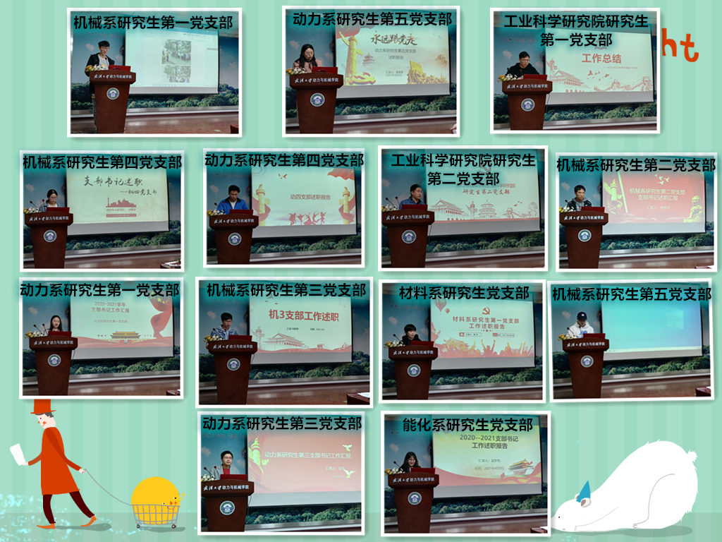 之后,会议进行先进研究生党支部和优秀研究生党支部书记述职评议。各研究生党支部书记从思想引领、组织建设、文化宣传等方面,对近一年来支部常规工作和特色活动开展情况进行汇报。与会的党员根据支部表现和述职情况进行打分。