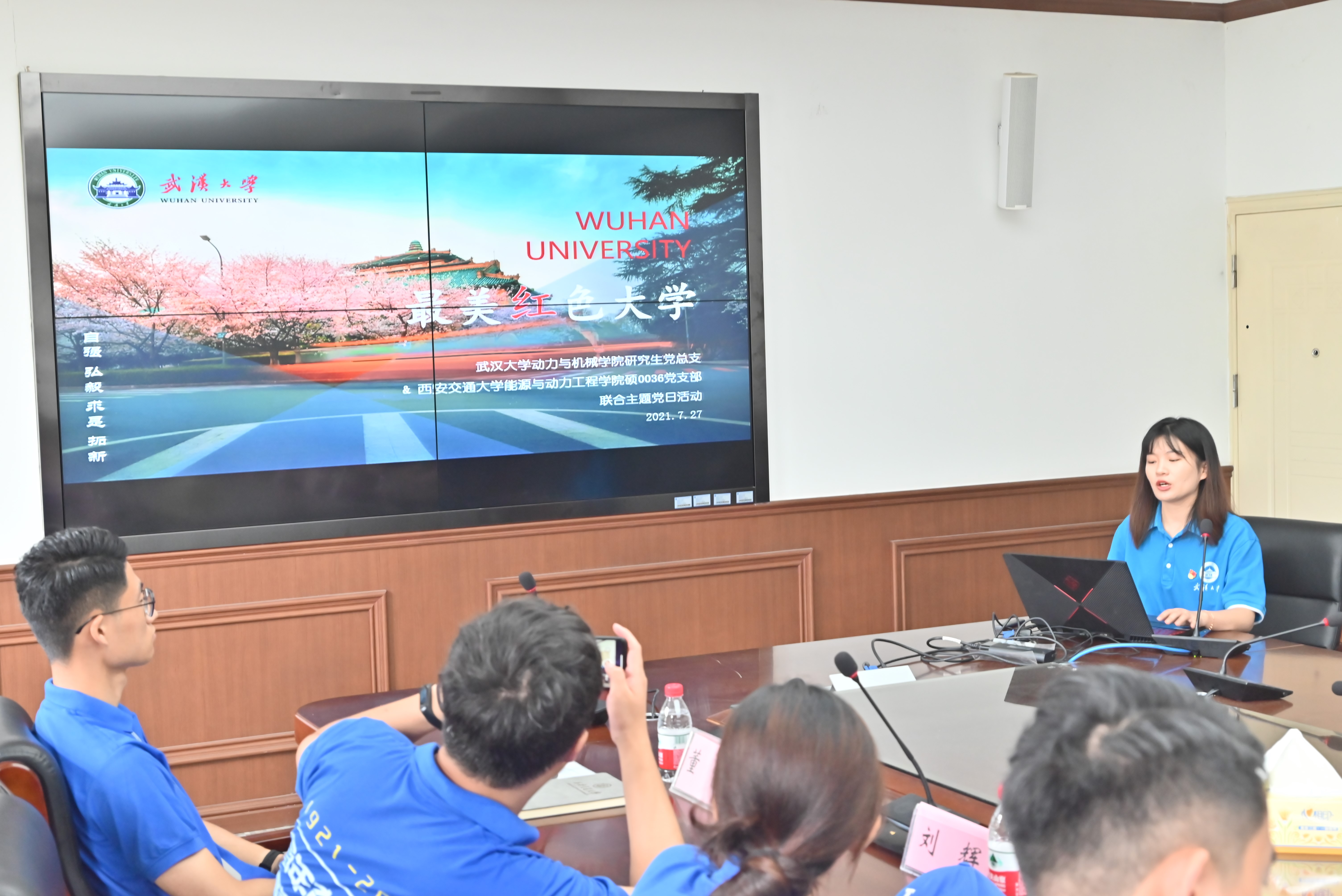 首先由杏吧 动力系研究生第四党支部唐巾洁介绍“最美红色大学”——杏吧 ,通过讲解杏吧 的红色历史传承、抗疫小故事,介绍杏吧 杏吧 的历史变迁与专业革新,向西安交通大学的老师和同学们生动展示了学校、学院风采风貌,弘扬了同心抗疫的武大精神。