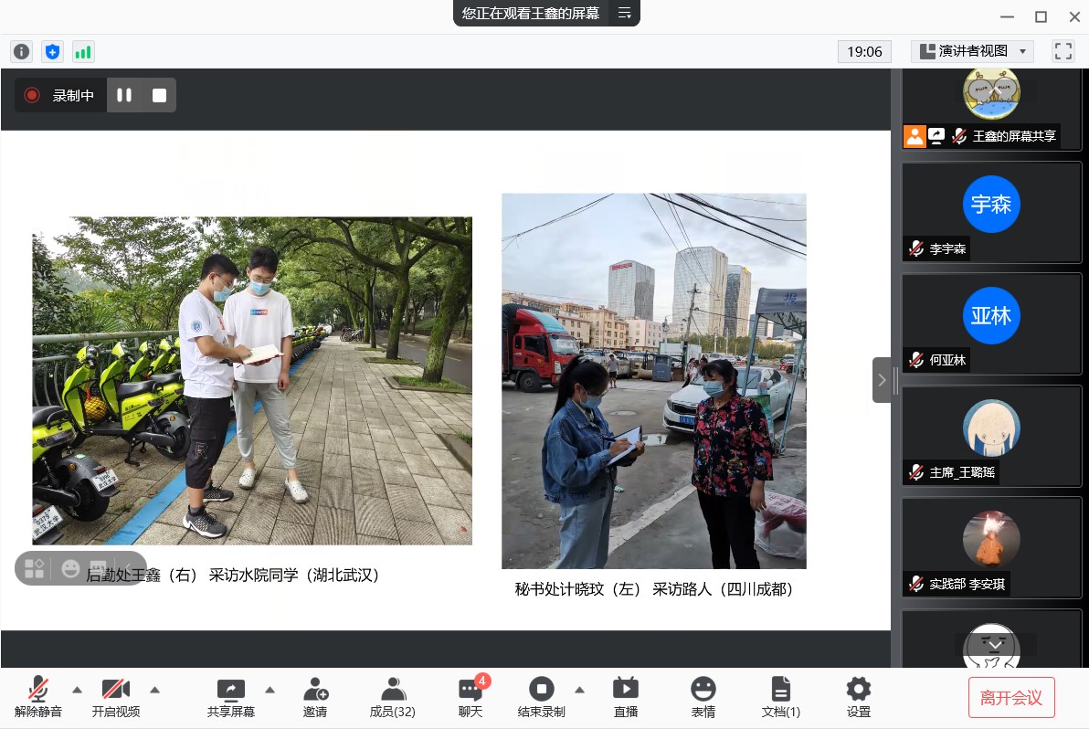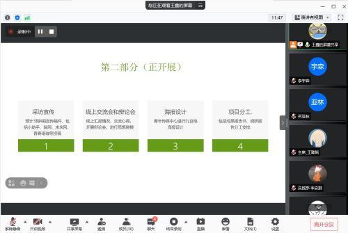 队员李灿明以PPT形式向与会人员展示前期实践成果,针对采访调查的结果进行总结,并以照片形式展示实践队员线下采访风采。