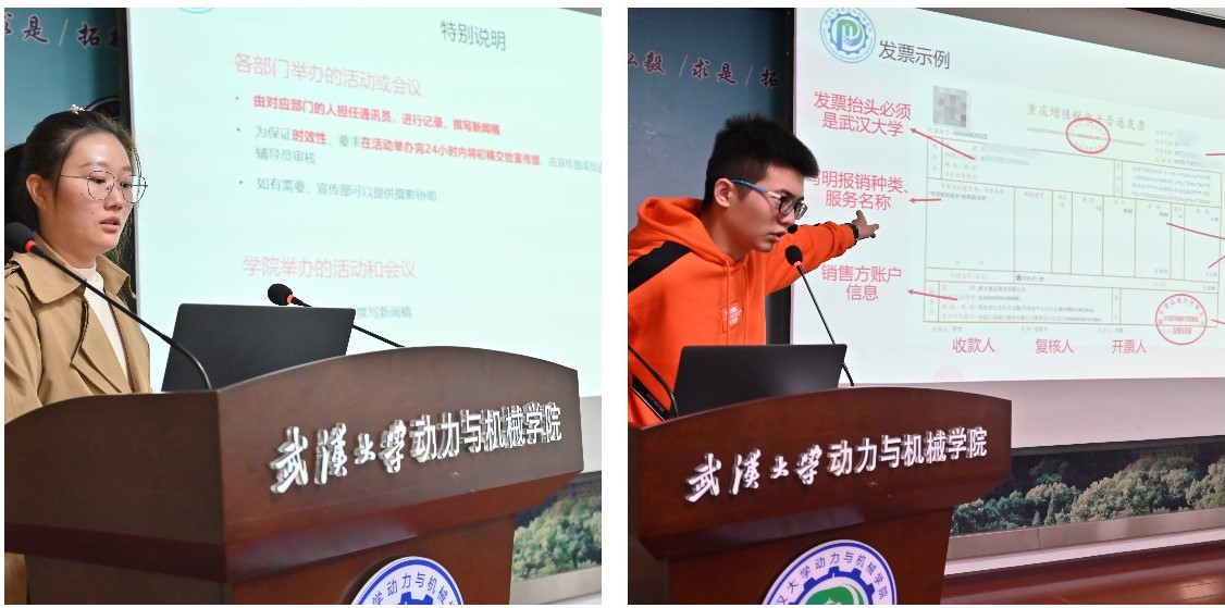 会议第五项由宣传部部门负责人郭思谊与主席团成员王雷阳分别对新闻稿的撰写格式规范与报账流程进行培训。郭思谊的培训分为标题、正文、配图和模板格式四个板块,强调了新闻稿在撰写过程中一定要牢记的一些规范。王雷阳主要强调了报销的流程以及对报销材料的要求。