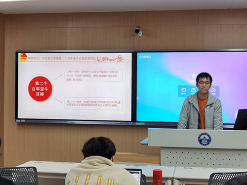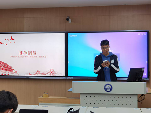 接着王卓同学从党发展的四个时期——新民主主义革命时期,社会主义革命和建设时期,改革开放和社会主义现代化建设时期,中国特色社会主义新时代时期来展现党的百年奋斗的重大成就,并从会议讲话中提炼出党的百年奋斗的历史经验,接着激励全体团员不忘初心,向第二个百年奋斗目标迈进。大家都志气满满,备受鼓舞。