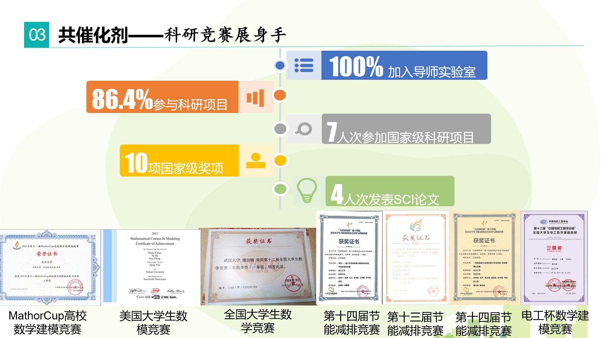 科研竞赛是共催化剂,能化班全员加入实验室,7人次参与国家级科研项目,科研参与率高达86.4%,斩获10项国家级学科竞赛奖项。4人次发表SCI论文(两篇为独立一作),立志将论文写在祖国大地上,为国家能源安全贡献力量。