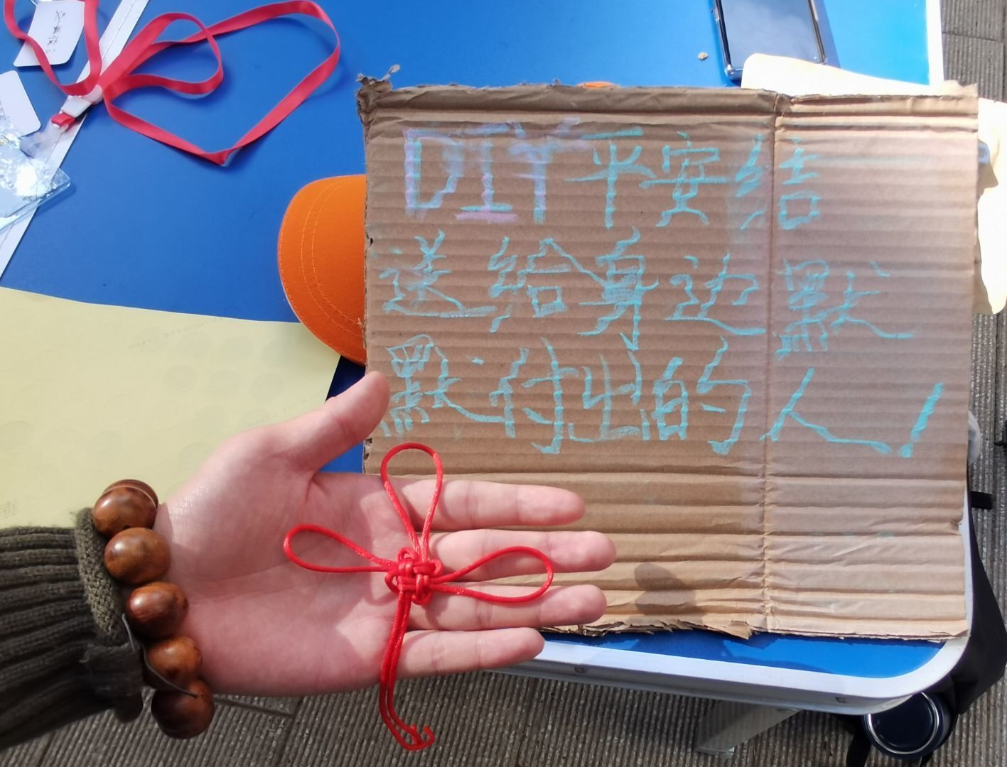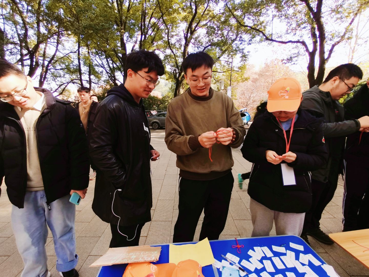 冬日寒冷,关爱却温暖人心。12月4日,志愿者们早早地在各个指定地点摆好摊位,等待着同学们的到来。万事开头难,刚开始只有零星的同学来参与,这让志愿者们有些沮丧。但随着太阳的逐渐上升,活动也被更多同学所知。喜欢平安结的同学跟着志愿者学习怎么结出好看的平安结,很多同学说着“好难啊”,却情不自禁地笑了起来,平安结里有同学们的汗水和欢笑,还有对兢兢业业的叔叔阿姨们的感恩之情。除此之外,同学们写的祝福语同样让人感动:”开心快乐每一天“,”感恩有你“……叔叔阿姨们在收到这些的时候十分感动。