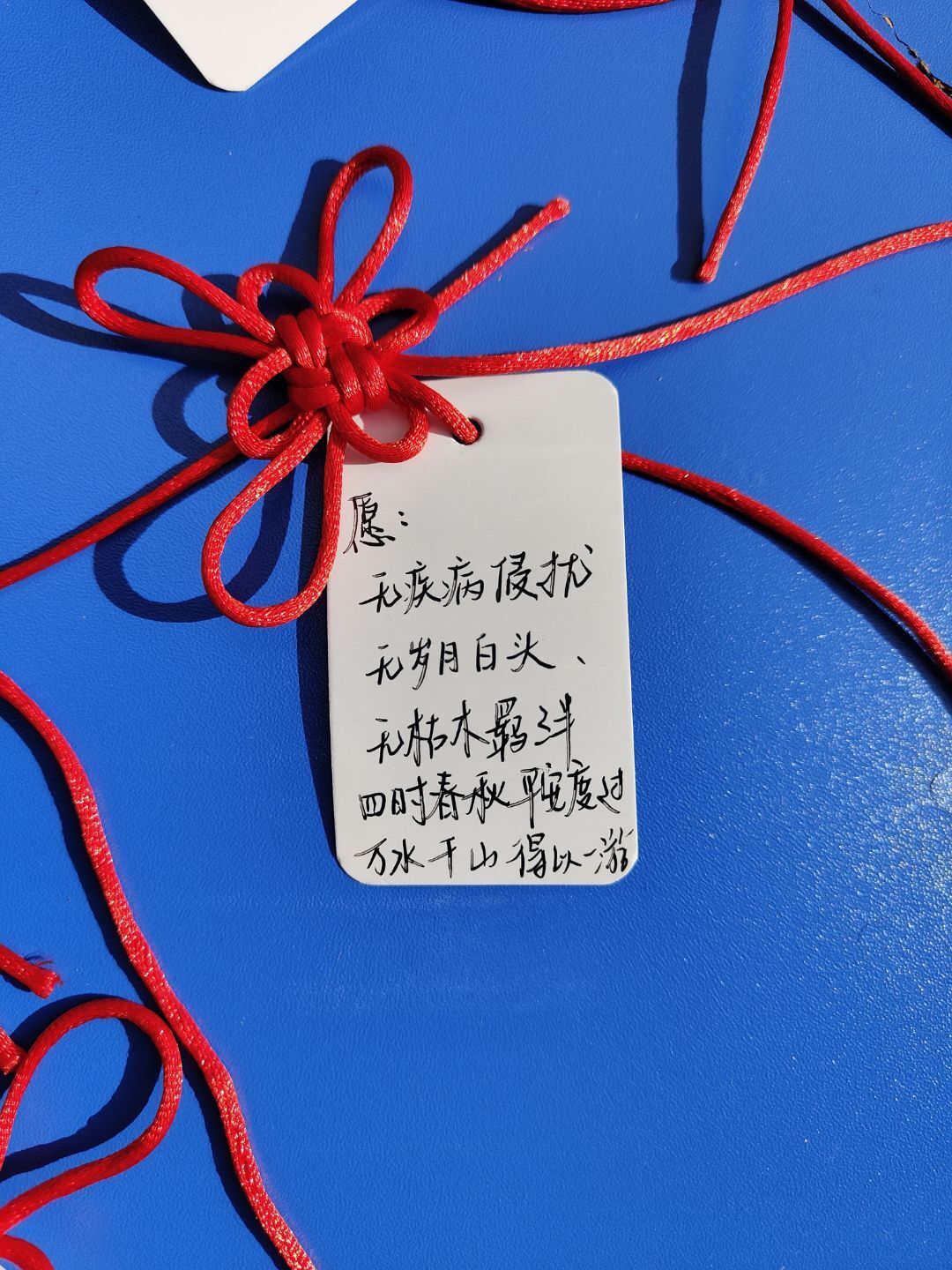 一个个平安结像是一个个美丽的花朵,在这寒冬中绽放。同学们对叔叔阿姨们的关爱之情也让这寒日温暖了起来。从总是做不好平安结的失落,到能独立结好的那一声惊呼,快乐的氛围逐渐感染了路人,都纷纷欲试。在同学们的努力下,一根根红绳变成了带着美好祝愿的平安结。我也有幸参与其中,虽然与标准略有不同,但其所蕴含的是满满的真情与祝福。