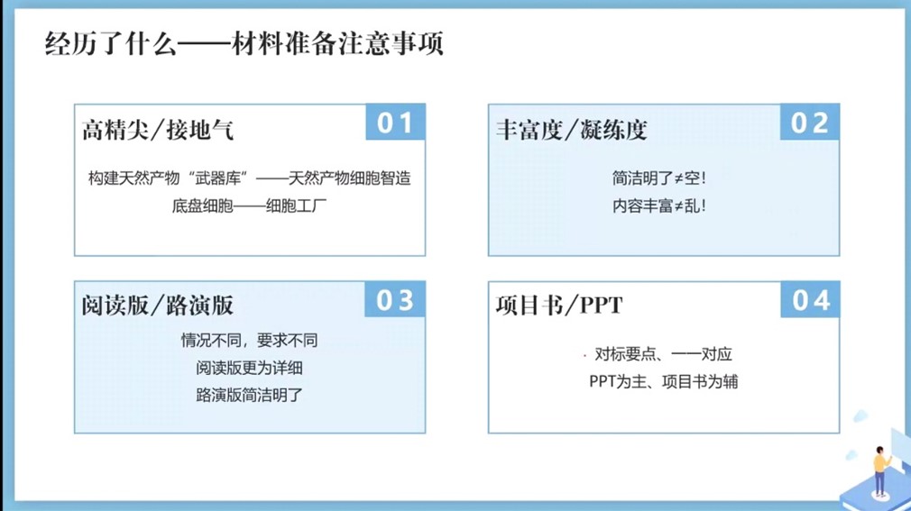 接着黄呈棋老师向同学们分享了他去年的参赛经验和感想。从项目来源到团队组建,黄老师详细讲解了队伍在前期准备过程中的注意事项,为同学们组建队伍提供了指导。从材料准备到路演答辩,黄老师以PPT为主体分享了如何才能“高精尖且接地气”地将团队成果展示出来,同学们受益匪浅。最后黄老师预祝同学们实现“从入门到精通”,在比赛中能够取得满意的成绩。