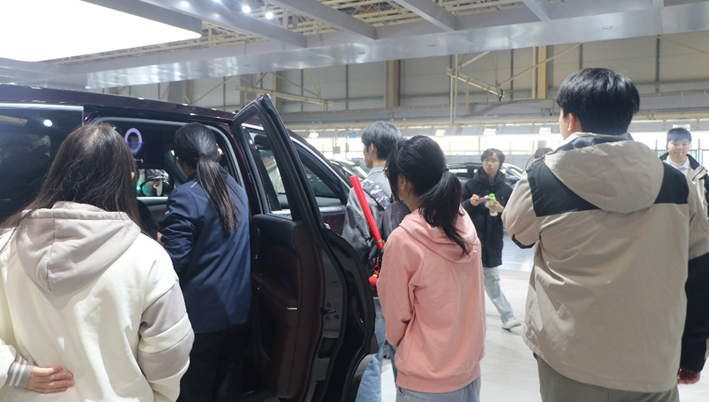 随后,师生们走进岚图工厂生产车间,实地观摩了自动化生产线、精密组装工艺和智能化质量检测流程。从车身焊接、涂装到总装,高度集成化、数字化的制造场景,生动展现出现代汽车工业的科技含量与生产效能。同学们结合自身机械制造、能源动力等专业背景,就工艺流程、技术难点、智能系统应用等问题与现场技术人员进行了深入交流。不少应届毕业生也借此机会,向企业投递了个人简历,表达了投身高端装备制造领域的强烈意愿。