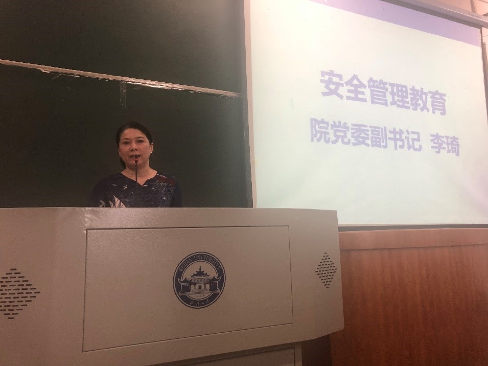 接着,李琦就安全管理工作做重要讲话。李琦代表学院党委和行政对2018级研究生新生的到来表示欢迎,同时围绕安全、守法、学业和成长四个主题词从四个方面向大家提出期望与要求:一是紧密围绕国家发展,志存高远,学好专业;二是要遵守党纪、国法、校规,认真学习《研究生守则》,做合格武大人;三是要警钟长鸣,确保实验室安全、人身安全、财产安全、心理安全;四是希望大家积极参加各类文体活动,强身健体,为祖国健康工作五十年。