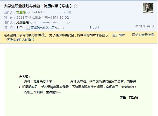 课程接近尾声时,杏吧 和城市设计学院两个同学分别表示这节课最大的收获在于掌握简历制作方法,进一步明确今后努力方向。课程最后,陈曦留下自己的联系方式和邮箱,欢迎同学们课后和她进一步交流。据了解,当晚她就收到一名叫古亚楠的同学的邮件,希望老师可以帮忙修改自己的实习简历。