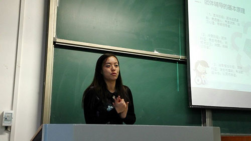 培训开始时,陈老师首先带大家做了一个简单的团体辅导,让全体心委与周围同学握手,揉肩,一起拉伸等等,瞬间活跃了现场的气氛,也拉近了在场心委之间的距离,让大家初步了解到了何为团体辅导。之后陈老师从团体辅导的概念,功能,基本原理,以及大学生团体辅导内容等几个方面为大家进行了讲解。她向新生推荐了一些团体辅导的主题,比如大学生生涯规划,了解自己性格优势等等,还以10级核电班以及13级本科生组织的团体辅导为例让大家更加深入的理解了团体辅导。此外,她还为大家列举了一些团体辅导的类型,其中包括小组访谈,素质拓展等等。