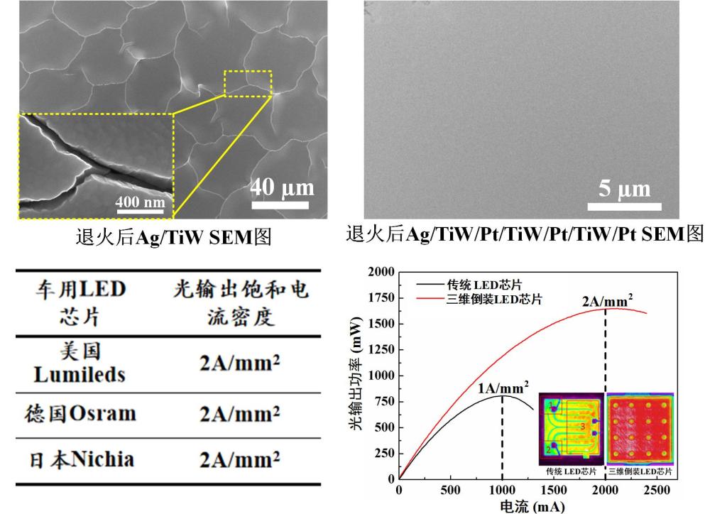此外,大电流注入下的LED芯片存在严重的电流聚集现象,传统的插指型电极结构无法使注入电流在LED芯片有源区中均匀分布。研究人员提出具有通孔接触式n型电极与高反射率p型接触电极结构的三维倒装结构LED芯片,提升了电流扩展均匀性,使蓝光LED芯片的饱和光输出电流提高到原来的两倍,打破了日本日亚、德国欧司朗、美国Lumileds公司对车用LED芯片的技术垄断。