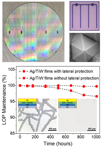 在先前研究工作的基础上,周圣军带领研究团队开发了一种新型的多金属层堆栈电极结构用于垂直结构LED芯片。由于不同金属层间存在热膨胀系数差异引起的残余应力,传统的多金属层堆栈结构很容易被环境湿度等因素诱发断裂失效。研究团队在Ag/TiW表面和侧壁沉积Pt/Ti保护层以隔绝环境湿度,从而提高金属电极的环境稳定性。采用低温Au-In共晶键合技术将沉积多金属层堆栈电极的LED晶圆片与四英寸硅衬底键合,然后利用248纳米的KrF激光剥离蓝宝石衬底,制备出硅衬底垂直结构LED芯片。采用这一新型多金属层堆栈结构电极的垂直结构LED芯片的光功率达到了1030 mW,在经过1000小时的老化实验后,光输出功率衰减不超过1%。