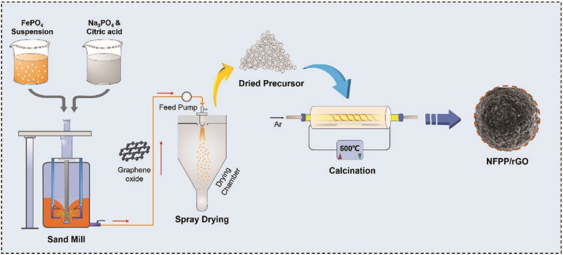 钠离子电池被认为是一类极具应用前景的电化学储能技术,从本质上讲,开发低成本的电极材料并实现简单经济的放大生产对于促进钠离子电池的商业化应用至关重要。然而迄今为止,可大规模生产的廉价正极依然少见。汪慧明等采用了一种绿色且易放大的合成方法,以FePO4、Na3PO4和GO为原料,获得了Na3Fe2(PO4)P2O7/rGO复合材料,该工艺具有极高的原子经济性。目标正极表现出超长的循环寿命(20℃下8000次循环后容量保持率为72.4%)和出色的倍率性能(100℃下为42.4 mAh•g-1)。特别是,由Na3Fe2(PO4)P2O7/rGO正极和硬碳负极组装而成的NFPP/rGO-HC全电池表现出192 Wh•kg-1 的能量密度和优异的循环性能(500次循环后容量保持率为85.2%)。该研究成果可推动Na3Fe2(PO4)P2O7/rGO正极在商业化钠离子电池的应用。