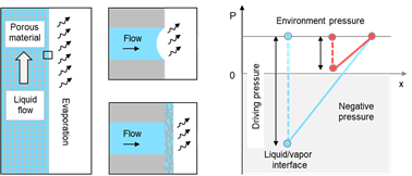 热管等热管理元件的核心物理过程是多孔材料中的蒸发驱动流动,其在使用过程中面临的最大问题是工质烧干问题。工质烧干限制了热管等散热元件的理论最高散热功率和极限传热长度。热管烧干的本质是多孔介质蒸发界面上的驱动力不足以提供多孔介质内部流动阻力。流动阻力大小取决于多孔介质流通水力直径,而驱动力大小取决于多孔介质蒸发界面的液相压降,界面液相压力受限于材料设计以及空化等现象,通常维持在0帕以上,难以进一步突破。