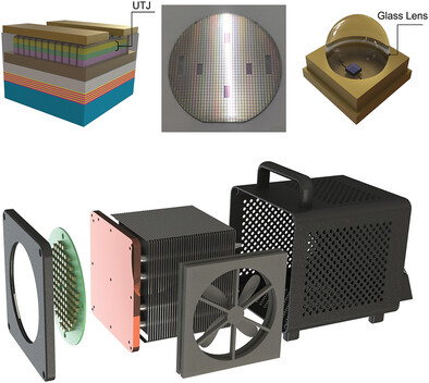 图:大功率AlGaN基超薄隧道结深紫外LED芯片结构、晶圆片、灯珠和手提式杀菌光源示意图