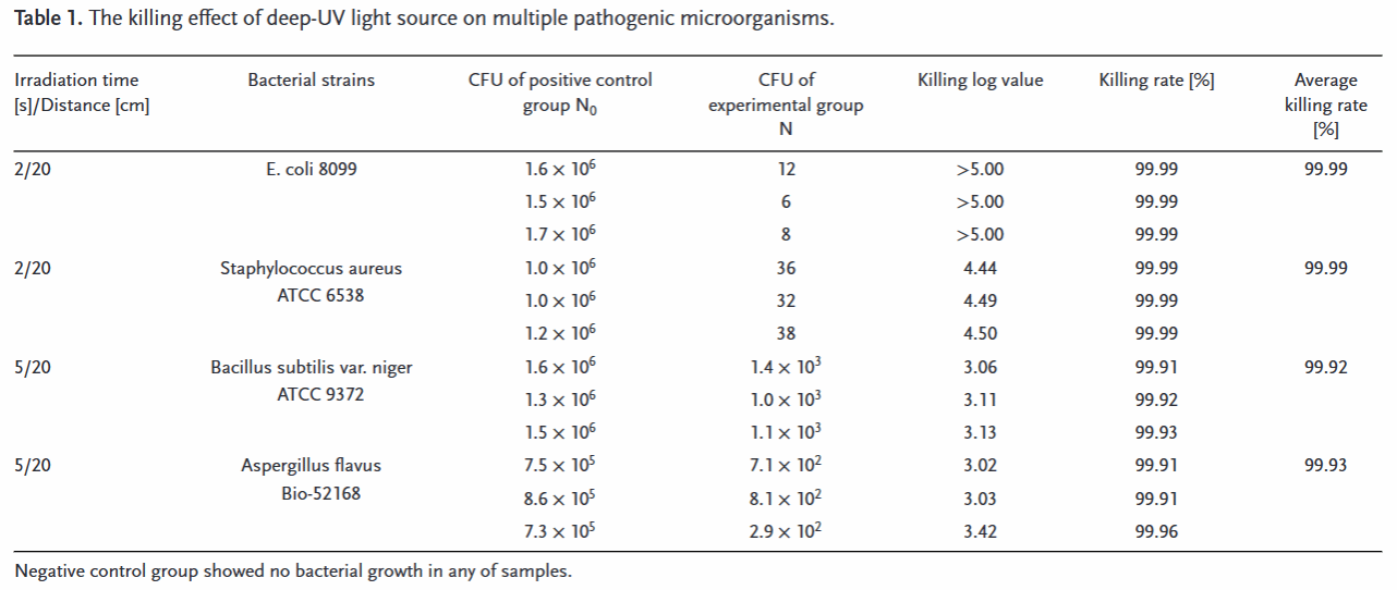 表:集成超薄隧道结深紫外LED芯片阵列的深紫外光源对多种病原微生物的杀灭效果