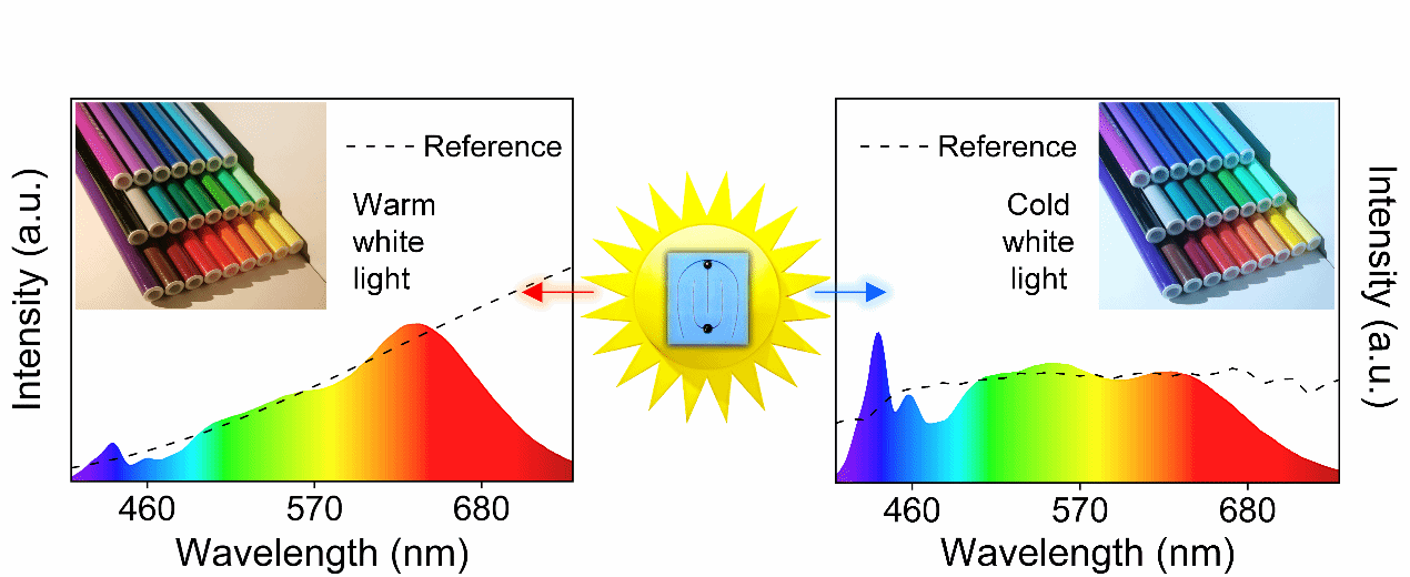 图:基于单片集成III族氮化物量子结构制备的全光谱白光LED的暖白/冷白光发射光谱