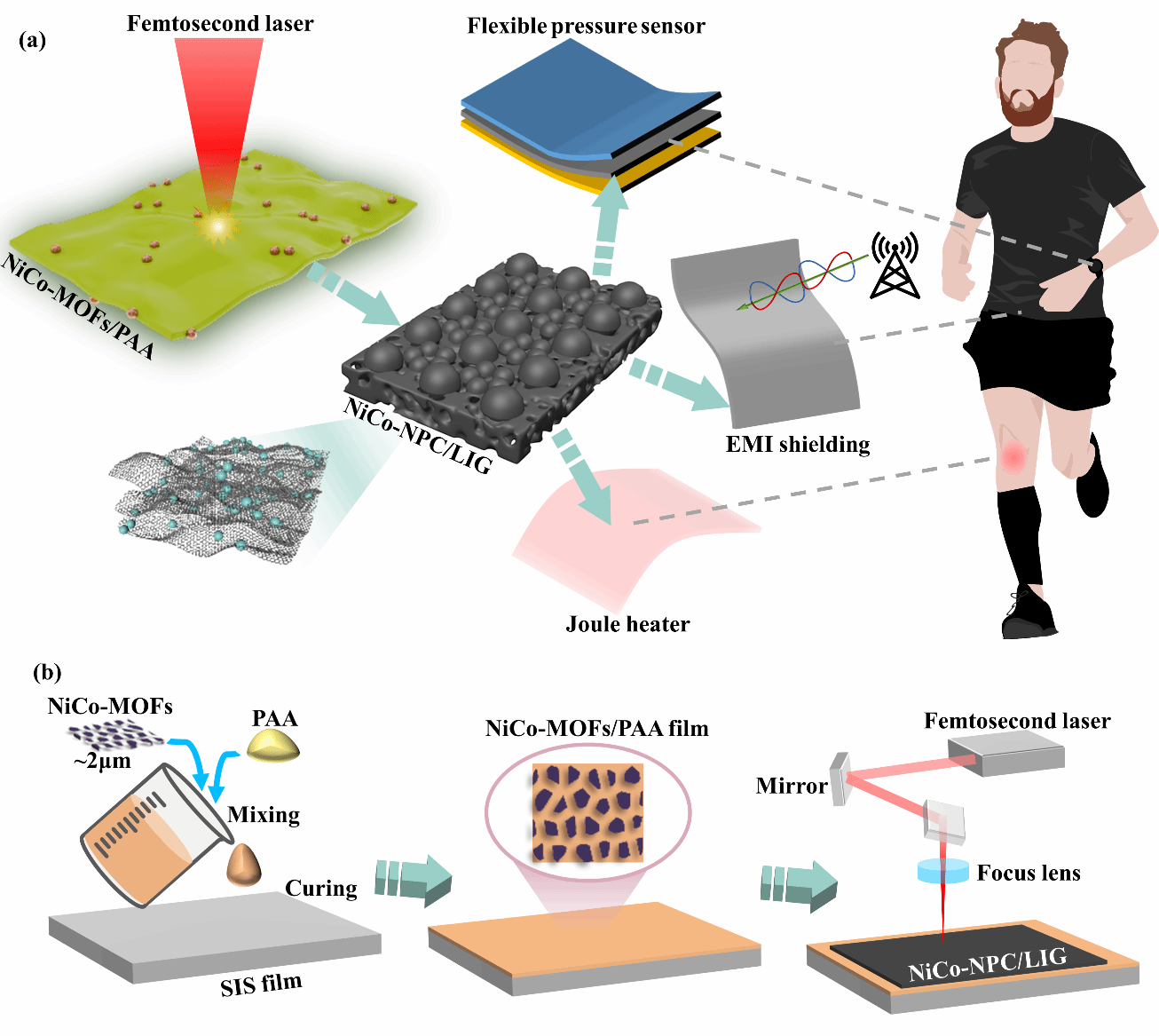 研究一:近年来,碳基导电纳米材料作为一种关键的电学材料,在柔性电子器件中得到了广泛的应用。然而,大多数碳基纳米材料(如炭黑、碳纳米管和石墨烯)的制备工艺效率低、成本高且不环保,限制了碳基柔性电子器件的发展。因此,具有高孔隙率和良好导电性的激光诱导石墨烯(LIG)作为一种新兴的三维导电材料被广泛报道。然而,现有的LIG面临传感功能单一、导电性低与纳米结构脆弱等难题。在这项工作中,通过飞秒激光辐照镍钴多孔碳(NiCo-MOFs)/聚酰胺酸(PAA)薄膜,首次制备了镍钴纳米多孔碳(NiCo-NPC)/LIG 薄膜,并将其应用于压力传感、电磁屏蔽和焦耳加热等领域。为开发基于 LIG 的高性能多功能复合薄膜提供了一条新途径。