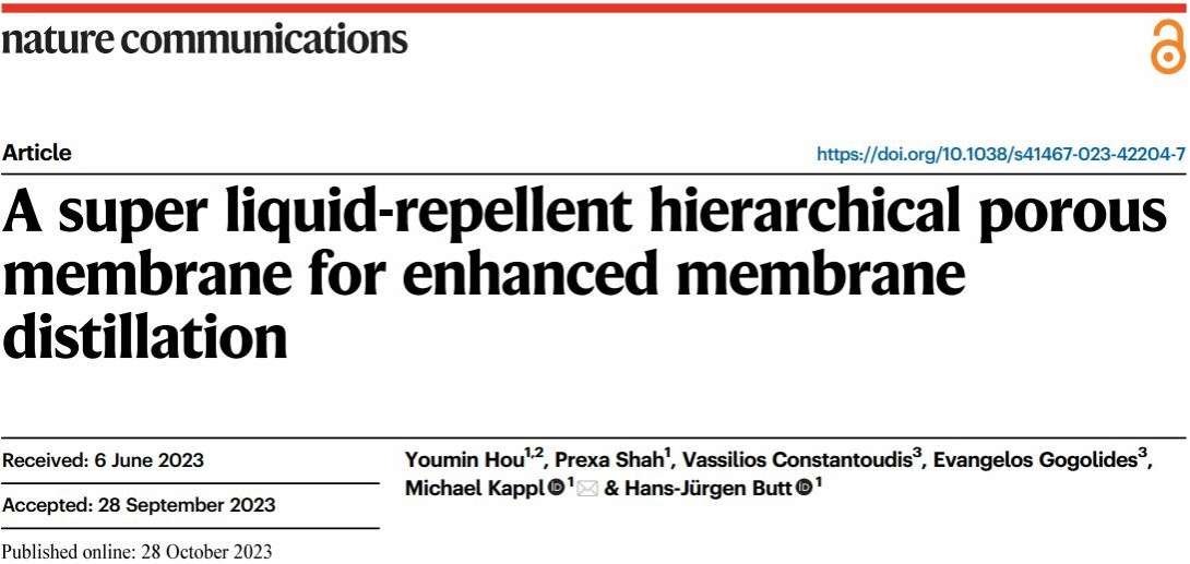近日,杏吧 侯佑民教授课题组在国际学术期刊《自然·通讯》(Nature Communications)发表了膜蒸馏海水淡化领域的研究成果,论文题目为“A super liquid-repellent hierarchical porous membrane for enhanced membrane distillation”。