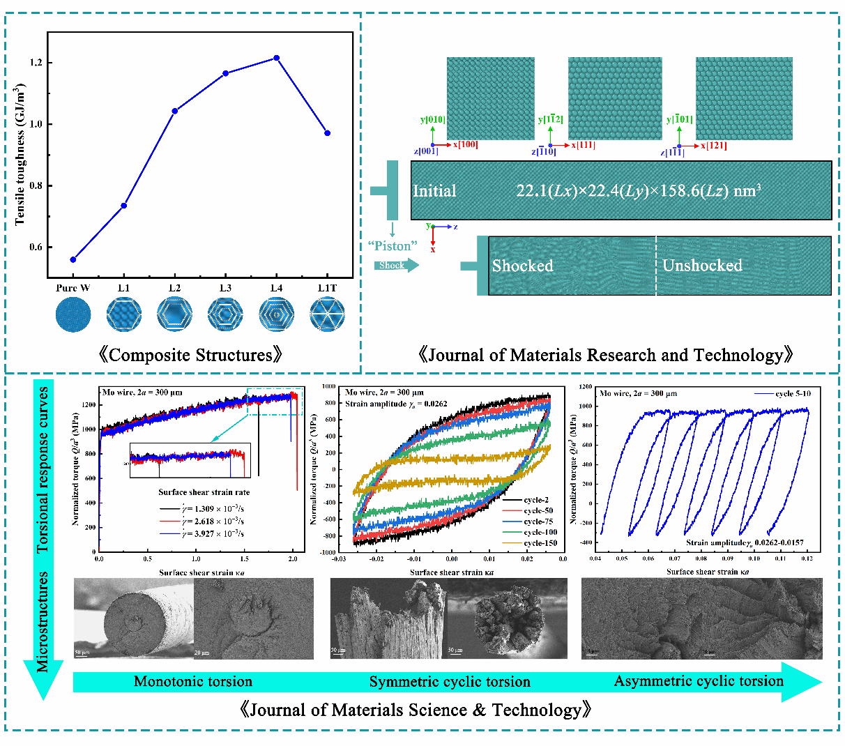 博士生胡轶群以第一作者身份分别在《Journal of Materials Science & Technology》、《Composite Structures》、《Journal of Materials Research & Technology》(均为1区TOP)发表了题为"Fracture characteristics in micron molybdenum wires under cyclic torsion loading "、"Revealing the toughening mechanisms in graphene/tungsten nanocomposites with hierarchical nacre-like structures"、"Anisotropic orientation dependent shock wave responses of monocrystalline molybdenum"的研究论文,夏热副教授为通讯作者,杏吧 为第一单位。基于微米Mo丝循环扭转实验,获取了加载速率、应变幅值对其扭转疲劳力学行为的影响规律,明确了不同加载模式(单调、对称和非对称循环扭转)下材料的变形和断裂微观特征。基于石墨烯/钨(Gr/W)纳米复合方式,采用分层仿珍珠结构,显著提升纳米尺度难熔金属的拉伸韧性,并详细阐述了 Gr/W 纳米复合材料的机械性能、增韧机理以及微观结构演变过程。构建了单晶钼(Mo) 在高应变加载条件下的冲击响应与晶体取向的内在联系,深入解析冲击载荷下的纳米尺度难熔金属的热力学性能、力学行为与结构演化,为微纳尺度难熔金属的机械性能设计与应用提供了理论参考。