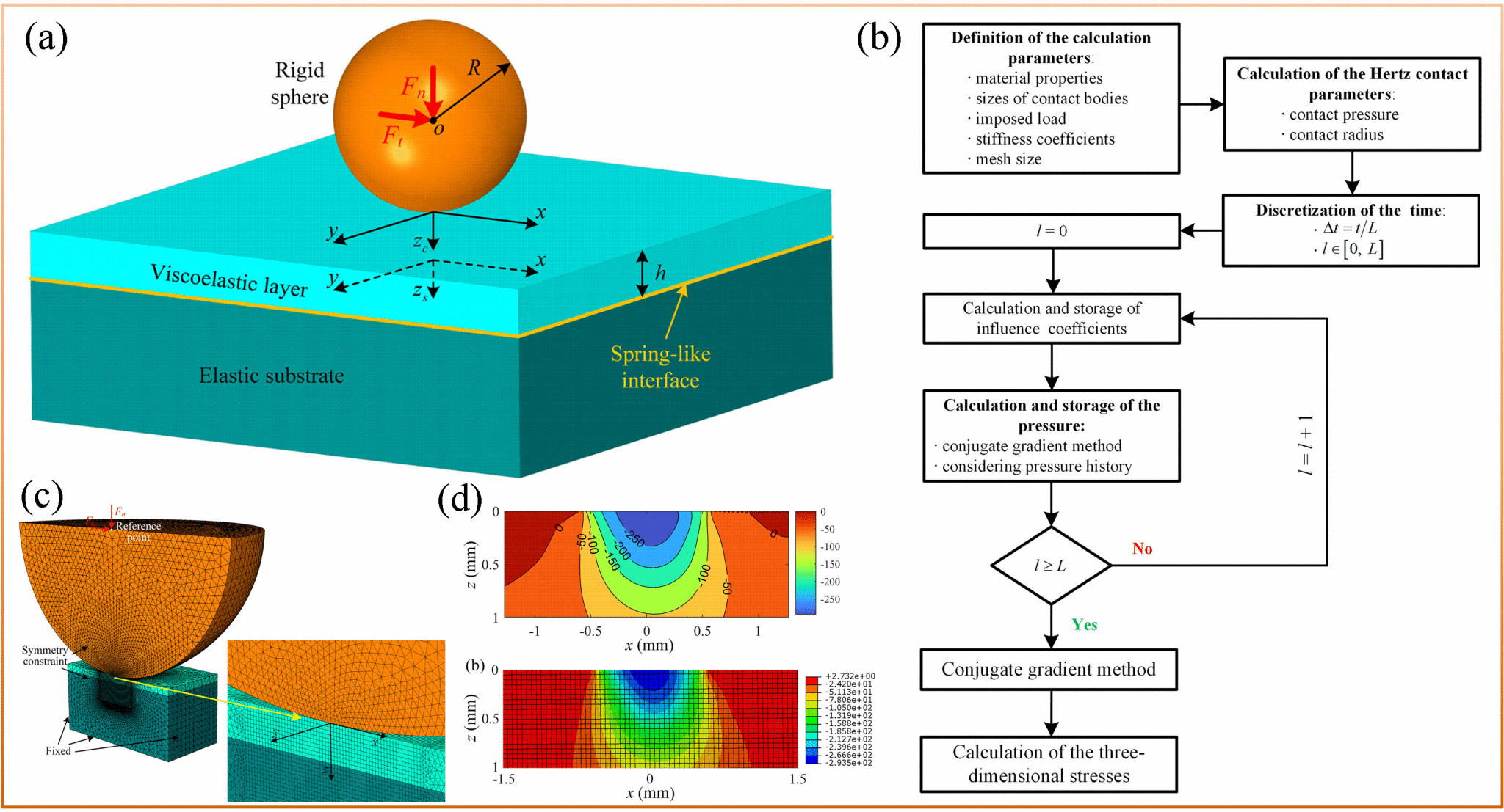 博士生丁苏杭针对不完全粘结界面粘弹性层状材料接触行为的理论研究发表在《Applied Mathematical Modelling》上,题为“A semi-analytical solution to incipient sliding contact on viscoelastic layer-elastic substrate with imperfectly bonded interface”。该研究提出了求解不完全粘结界面的粘弹性层状材料的接触行为的半解析方法。基于频域下的Papkovich-Neuber位移势函数计算影响系数,将弹性解中的弹性常数替换为蠕变函数以涵盖粘弹性层的时间依赖性。使用离散卷积-快速傅里叶变换获取外部载荷引起的位移和应力,利用共轭梯度法计算层状材料的表面压力和内应力分布。通过对时间、松弛时间、松弛模量、刚度系数、涂层厚度和摩擦系数的参数化研究,分析了力学参数对接触行为的影响。该研究揭示了粘弹性层状材料的接触力学行为,为涂层材料的开发和设计提供了高效的参数化研究方法。