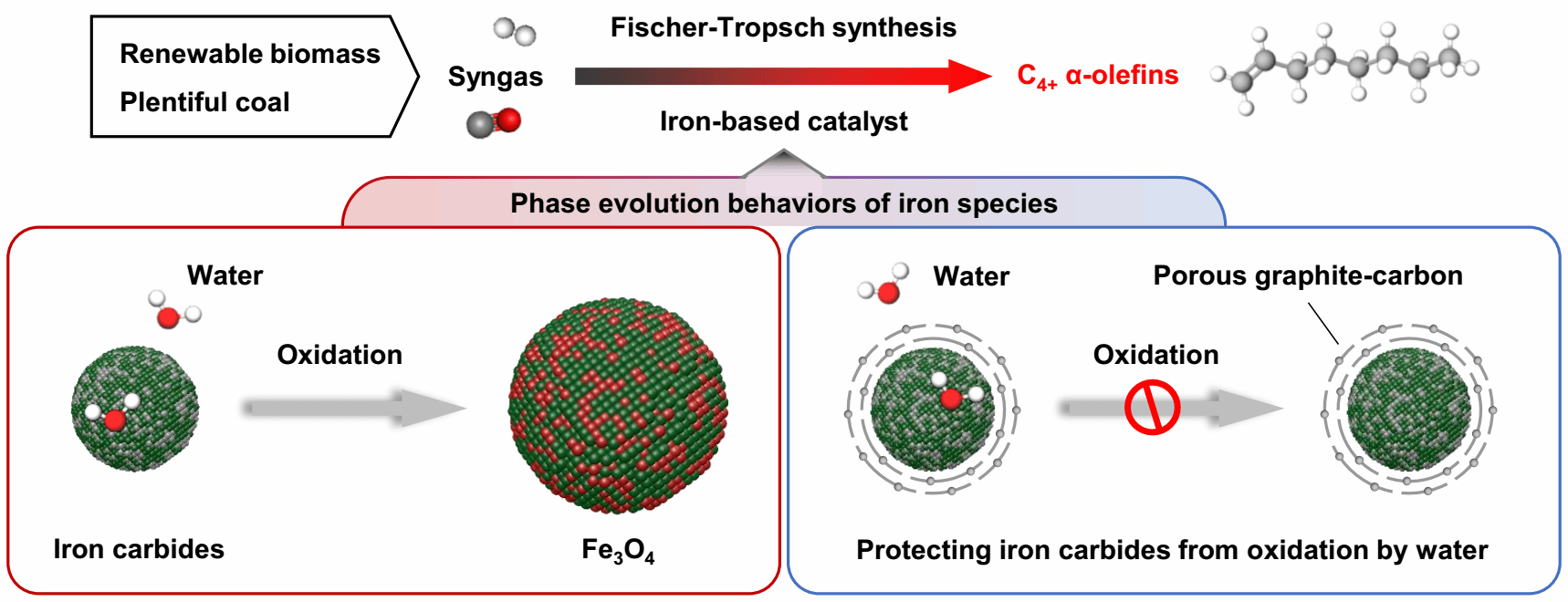 定明月教授团队揭示了不同铁物相之间存在显著的尺寸差异,发现碳化铁氧化为Fe3O4是一个体积增加的过程,基于此设计构筑了多孔石墨碳封装碳化铁的新型催化剂,刚性石墨碳有效保护了碳化铁在反应中不被氧化(图1),使其在CO转化率>80%、反应温度330 °C等苛刻的反应条件下仍然可以保持稳定,进而表现出了超高的反应活性,并且添加适量Na助剂后C4+ α-烯烃的时空产率高达11.35 g·gcat-1·h-1,相比于文献中催化剂上的烯烃时空产率高出了一个数量级。这项工作为设计高活性、高稳定性的铁基催化剂提供了新的思路。