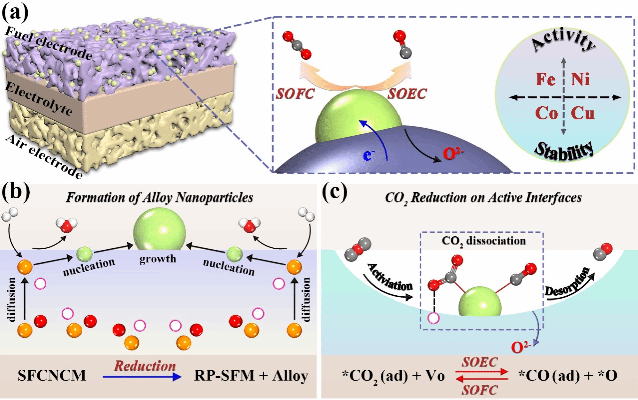 定明月教授团队采用以中熵氧化物(SFCNCM)为基体,结合原位溶出技术成功获得了Fe-Co-Ni-Cu四元合金钉扎的钙钛矿氧化物。该电极表现出优异的氧表面交换能力和CO2活化能力,将其作为固体氧化物电池电极在可逆CO2-CO转化模式中展示了良好的电化学性能和稳定性。采用第一性原理计算揭示四元合金自中熵钙钛矿氧化物中溶出的可能性以及用于CO2转化时各金属离子的功能,发现Fe和Ni增加了电催化活性,Co和Cu与母体的强结合提高了界面稳定性。本研究为多组分金属原位脱溶氧化物催化剂的合理设计和优化提供了新的维度和理论视角。