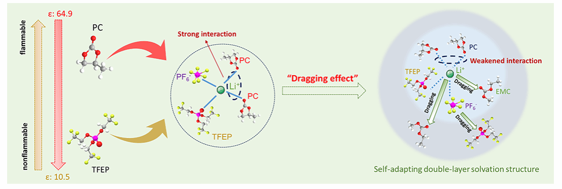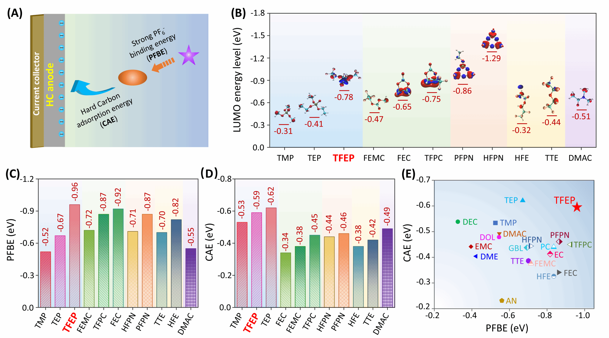 硬碳负极是钠离子电池最具应用潜力的负极材料,但是其与目前的碳酸酯基电解液体系兼容性差,极大阻碍了其工业化应用。鉴于电极/电解质界面性质高度依赖于亥姆霍兹平面的构型,陈龙等确定了PFBE(阴离子结合能)和CAE(碳吸附能)两个重要指标,并以此进行溶剂筛选,确定了TFEP为最佳溶剂。合理设计的TFEP基电解质使Na||HC半电池和2.8 Ah HC||Na4Fe3(PO4)2P2O7软包电池具有优异的倍率性能、长循环寿命、高安全性和低温适应性。