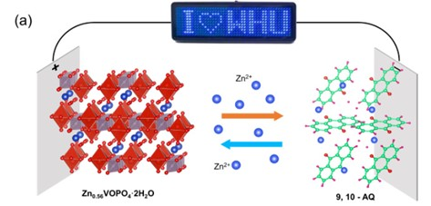 水系锌离子电池具有安全性高、原料丰富、成本低廉、绿色环保等诸多优点,是大规模储能电池的理想选择之一。然而目前锌金属负极存在枝晶、腐蚀、钝化和利用率低等问题。尽管目前有很多针对锌金属和电解液的改性策略,但是都没有从根本上解决上述问题。开发含锌正极与非锌负极相匹配的“摇椅式”电池是应对上述挑战的一种有效策略,然而,这种能够提供可逆和稳定的Zn2+存储的含锌结构却很少报道。赵栋等通过溶剂热还原法制取了Zn0.56VOPO4∙2H2O,并首次揭示了其储锌机理,该正极可提供104.2 mAh g-1的可逆容量和优异的循环性能。与有机材料9,10-AQ匹配构建了“摇椅式”水系锌离子电池,400周循环后容量保持率为87.4%,该工作可为大规模储能用水系锌离子电池的设计提供新思路。