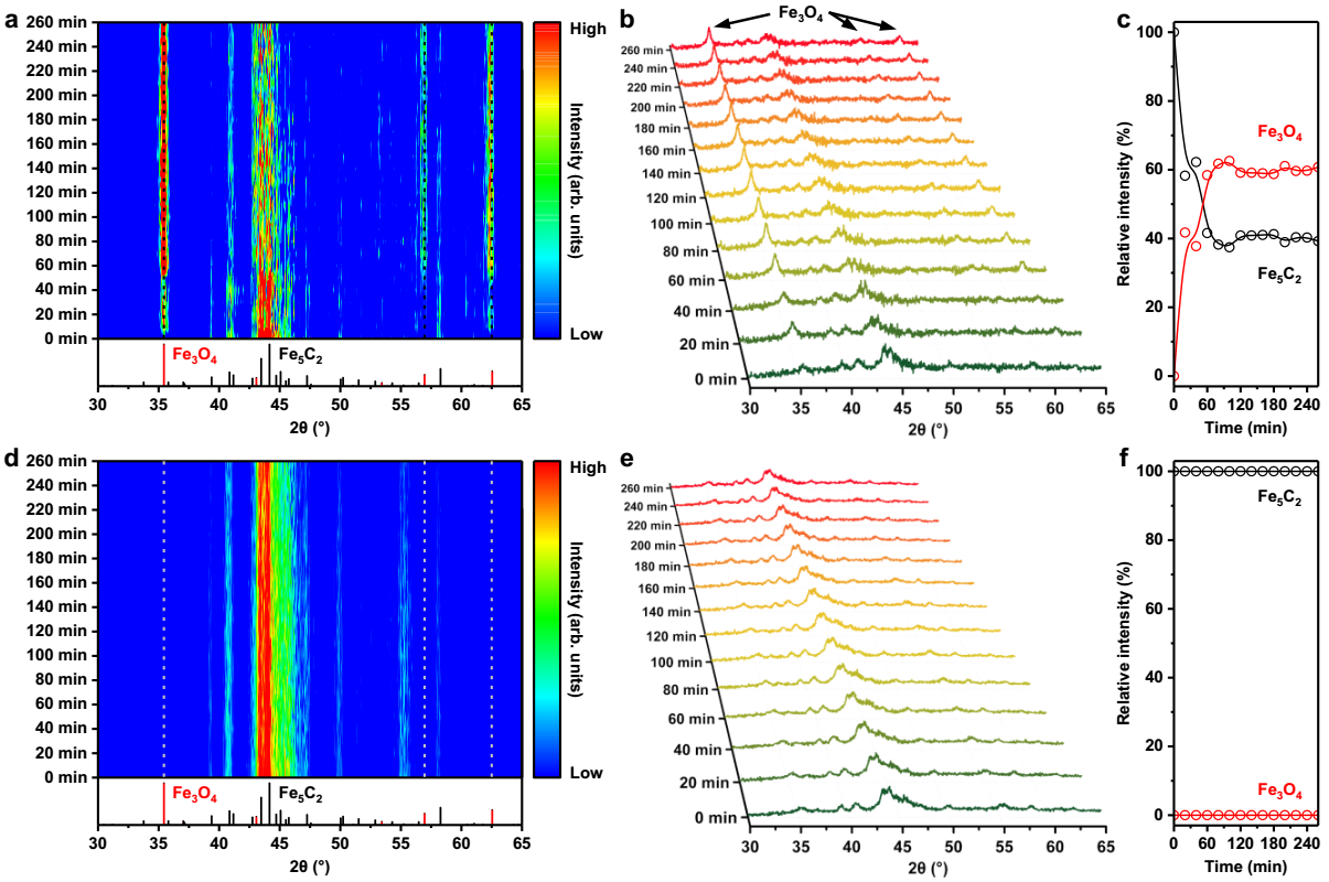 铁基催化剂具有价格低廉、反应条件广、烃类分布易调控的优点,是常用的工业FTS催化剂。由于合成气转化过程中同时存在H2、CO、H2O对铁物种的还原、碳化、氧化过程,铁基催化剂在反应中通常会演变为碳化铁和Fe3O4的混合物相。碳化铁是FTS生成烃类产物的活性相,而Fe3O4对水煤气变换副反应有着很高的反应活性。因此,保护碳化铁在反应中不被水分子氧化是非常必要的。