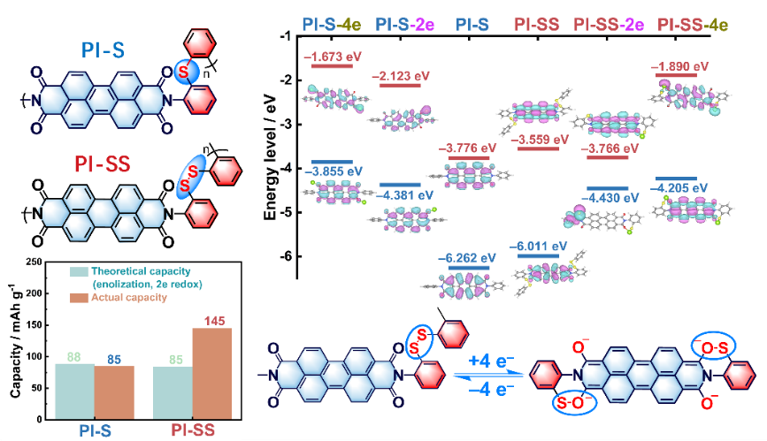 设计合成了一类二硫键聚酰亚胺镁电池正极材料,聚合物的柔性框架打破了无机晶格对镁离子嵌入的限制,并通过共轭结构的电荷离域削弱了与镁离子的相互作用,有效提升了储镁反应的可逆性和动力学。并且,通过二硫键和硫氧键的可逆断键/成键,促进了羰基的烯醇化和与镁离子的缔合/解缔,有效的提高了储镁容量。该工作近日发表在Energy Storage Materials上(Energy Storage Materials, 2024, 71, 103672)。