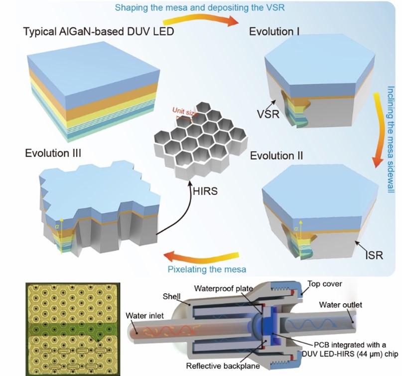周圣军课题组利用紫外衍射曝光与电感耦合等离子体刻蚀技术将深紫外LED台面刻蚀为紧密排列的六边形亚台面阵列,每个亚台面侧壁倾斜角为46°,并在侧壁表面蒸镀高反射率铝(Al)反射镜,形成蜂窝状倾斜反射镜阵列。通过蜂窝状倾斜反射镜阵列将TE和TM偏振光重定向至器件顶部出光面,同时缩短光子横向传播路径,减少材料对深紫外光的吸收损耗,显著提升了深紫外LED芯片的光提取效率。实验结果表明,集成蜂窝状倾斜反射镜阵列的深紫外LED芯片的光输出功率从78.2 mW提升到152.4 mW。进一步,团队基于集成蜂窝状倾斜反射镜阵列的AlGaN基深紫外LED芯片研制出流速1L/min的微型流水杀菌模组,对大肠杆菌(E. coli 8099)的灭活率达99.99%(4-log灭活),满足饮用水净化需求。此项工作从基础科学到工程应用实现全链条创新,不仅为深紫外LED芯片性能提升开辟了新路径,更推动了固态深紫外光源在公共卫生领域的实用化进程。