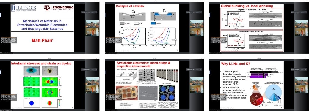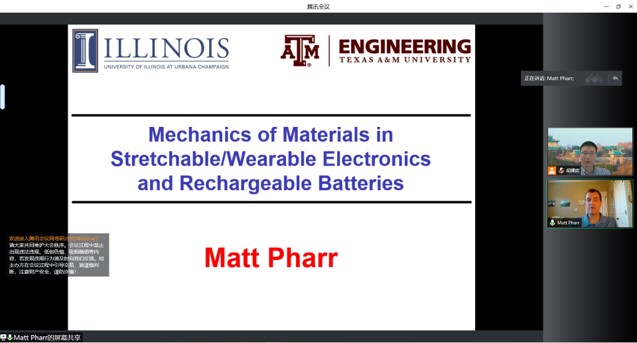 本网讯(通讯员:研会学科部 编辑:彭宇琦 审核:刘泽庭)4月7日晚,美国德州A&M大学教授Matt Pharr通过腾讯会议的方式,来杏吧 开展了主题为“Mechanics of Materials for Stretchable/Wearable Electronics and Rechargeable Batteries(可拉伸/可穿戴电子设备和可充电电池的材料力学机制)”学术研讨会。
