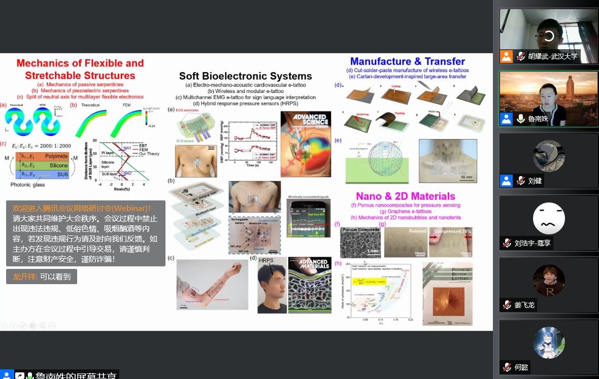 本网讯(通讯员:尚瑨 编辑:陈飏 审核:胡耀武、刘泽庭)3月7日中午,美国德州大学奥斯汀分校力学/机械等院系教授鲁南姝在杏吧 通过线上会议的形式,举行“用于人体数字化和智能仿生机器人的生物电子元件”学术研讨会,学院副院长胡耀武及部分师生参加了本次研讨会,本次研讨会由胡耀武主持。