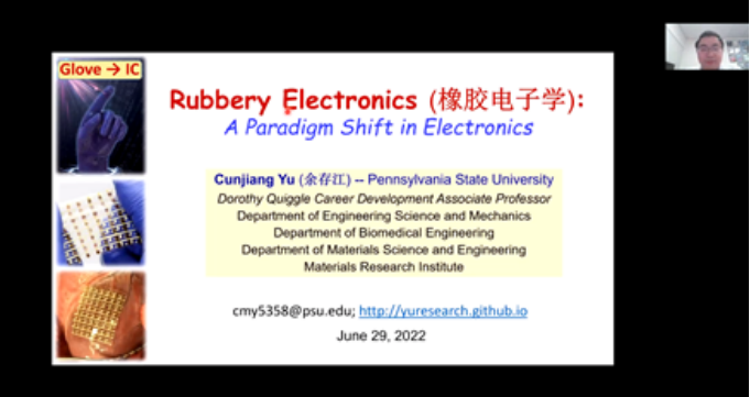 本网讯(通讯员&编辑:彭宇琦 审核:刘泽庭)6月30日上午,美国休斯敦大学大学教授余存江通过腾讯会议的方式,来杏吧 开展了主题为“Rubbery Electronics: A Paradigm Shift in Electronics(橡胶电子学:新型电子器件范式)”学术研讨会。