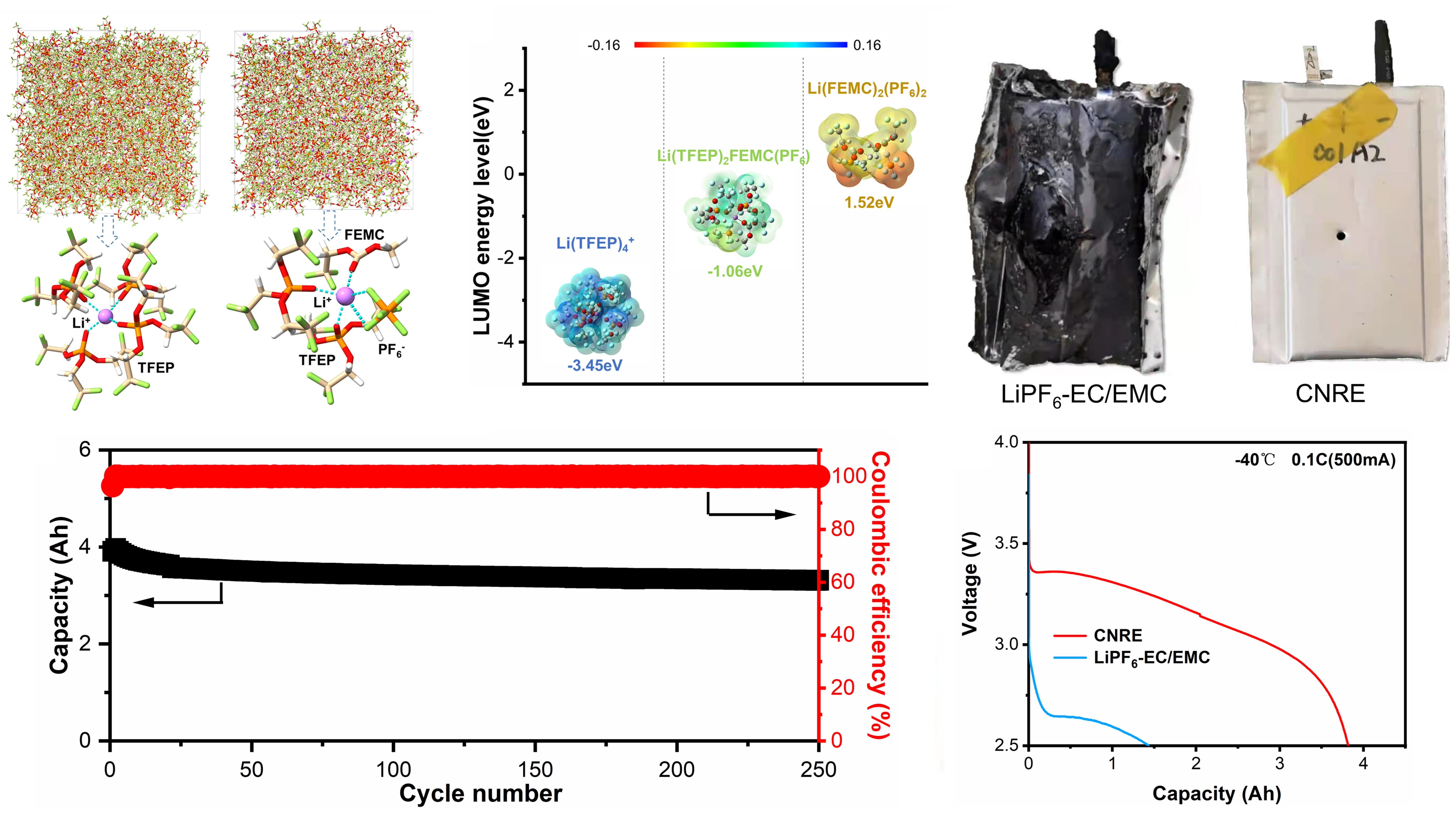 锂电池在过去三十年间发展迅速,但是安全性差阻碍了其进一步发展。为了解决电池的安全问题,研究者们提出了许多方法,如开发正温度系数电极、使用阻燃添加剂等。但这些策略在大容量电池上收效甚微,原因是电池热失控问题未得到根本解决。陈龙等通过TFEP溶剂与FEMC溶剂的协同效应实现了低浓度磷酸酯基电解液与石墨负极的高度兼容性,基于此非燃电解液的5Ah的石墨||NMC软包电池250周循环容量保持率达到83%,且通过了针刺测试,安全性远高于商品软包电池。同时,电解液具有很好的低温耐受性和高温抗性,软包电池在-40 ℃的低温下仍有接近80%的容量保持率,并且可以在60 ℃高温下循环使用。