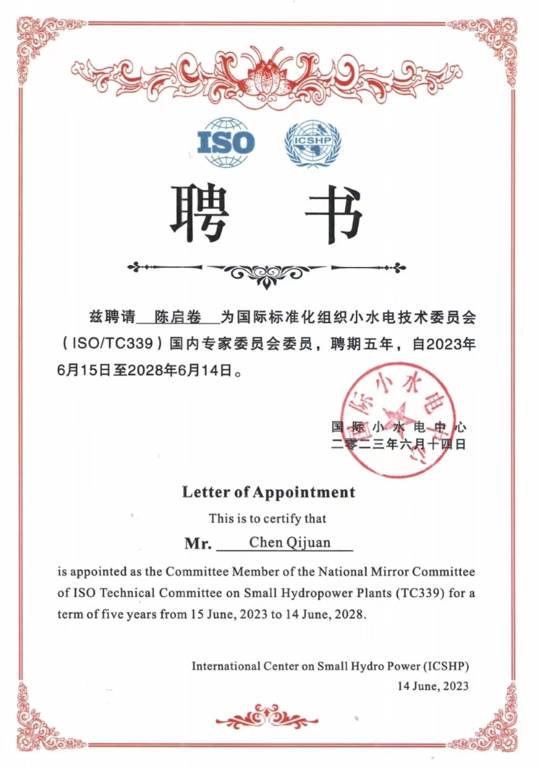 陈启卷教授被聘为国际标准化组织小水电技术委员会(ISO/TC339)国内专家委员会委员