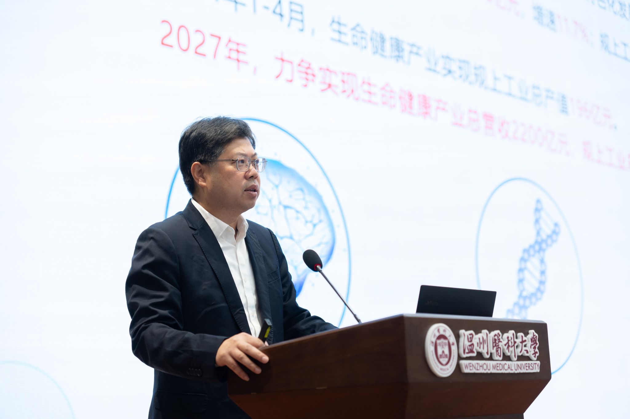 开幕式后,金龙军作《科技创新 基础融合 推动新质生产力发展》专题报告。他强调,习近平总书记对科技创新工作前所未有、一以贯之的高度重视,温州地区生命健康产业具有“五医”融合发展、“双核引领、三带布局”空间布局的好生态,企业招引好政策,中国眼谷与中国基因药谷好平台等特点。他通过生命健康产业关键领域发展现状,提出新质生产力驱动下挑战与机遇并存,并针对基础临床融合的关键领域给予未来趋势预测与战略建议。