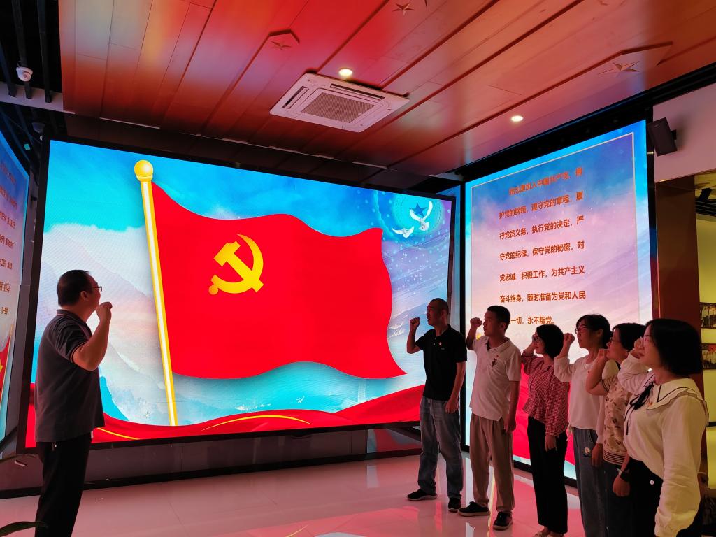 在瑞安国旗馆,党支部书记周鹏带领全体党员重温入党誓词。