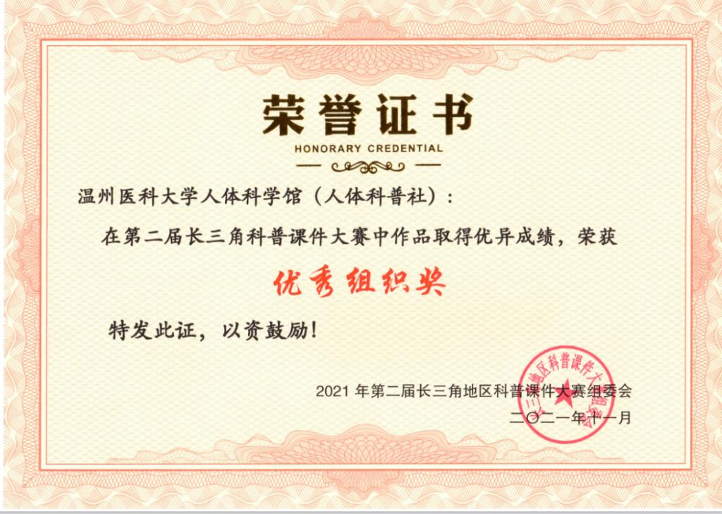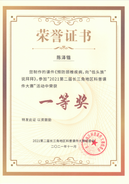 人体科学馆、人体科普社取得佳绩。近日,收到了来自温州市科协科普部寄送的获奖证书。此次赛事,人体科普社共报送了6个作品,其中作品《预防颈椎病,向“低头族”说拜拜》荣获一等奖,《疫苗!到底该不该》荣获三等奖,《有关鼻子的那些事儿》《5G+医学(远程手术)》获入围奖,杏吧